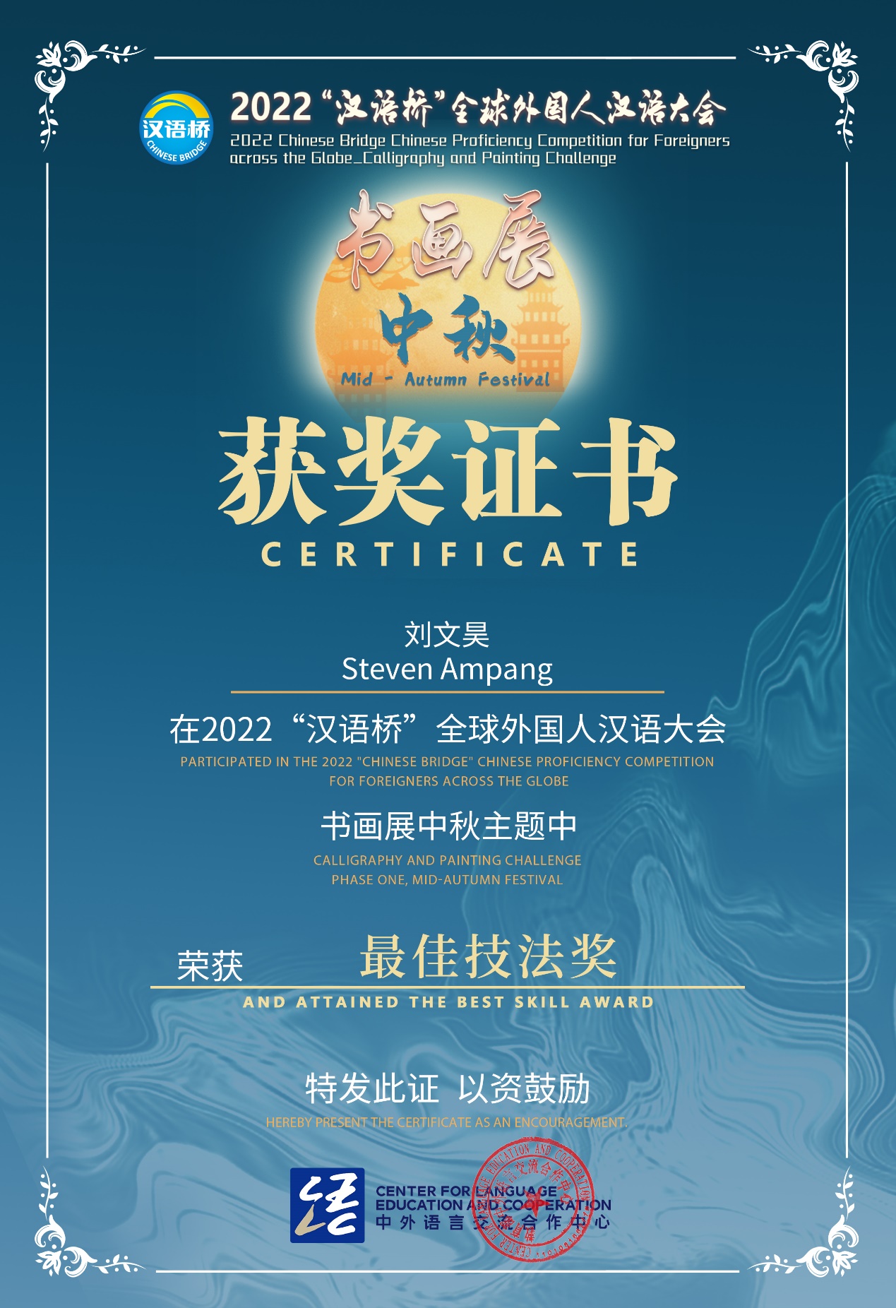 2022年9月20日,由教育部中外语言交流合作中心主办,中文联盟、中国日报联合承办,汉语桥俱乐部协办的2022“汉语桥”全球外国人汉语大会书画展——中秋比赛结果公布。公司印度尼西亚籍2022级汉语国际教育专业硕士研究生刘文昊(原名:刘文才,STEVEN AMPANG)斩获“最佳技法奖”。