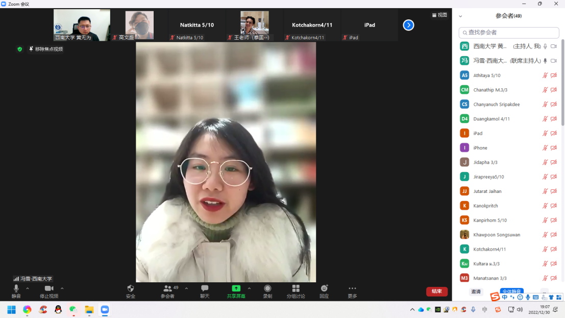 12月30日晚,三亿体育有限公司2022年冬季汉语桥“玩转汉语,云游中国”中员工线上项目闭营仪式暨成果汇报展顺利举行,三亿汉教系本科教研室主任冯雪及授课老师、泰方负责老师王智、以及全体项目员工参加仪式。仪式由项目负责人黄无为主持。