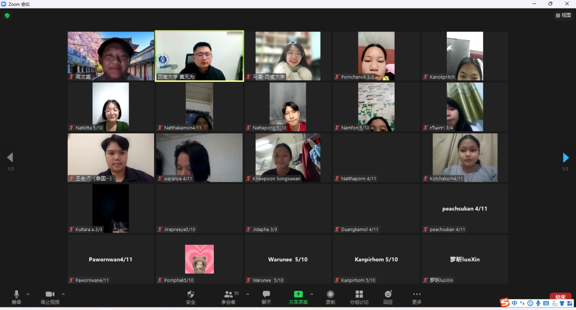 据悉,本次线上项目总共有88位来自泰国佛统府伟赉恳中学的员工报名参加,为期两周,采用录播和直播两种方式进行教学。录播课程共有5次,包括《自我介绍》和《中国员工的一天》等主题,所有录播视频均配有中泰字幕,便于同学们学习和理解。直播课程7次,包括《影视作品里的中国传统文化》《网红之都重庆的昨天、今天与明天》《汉语学习:跨文化交际》《新时代中国社会变迁》等主题教学内容。这些课程旨在培养泰国员工听、说、读、写的基础语言能力,增强他们的学习兴趣,为今后进一步学习汉语打下基础。