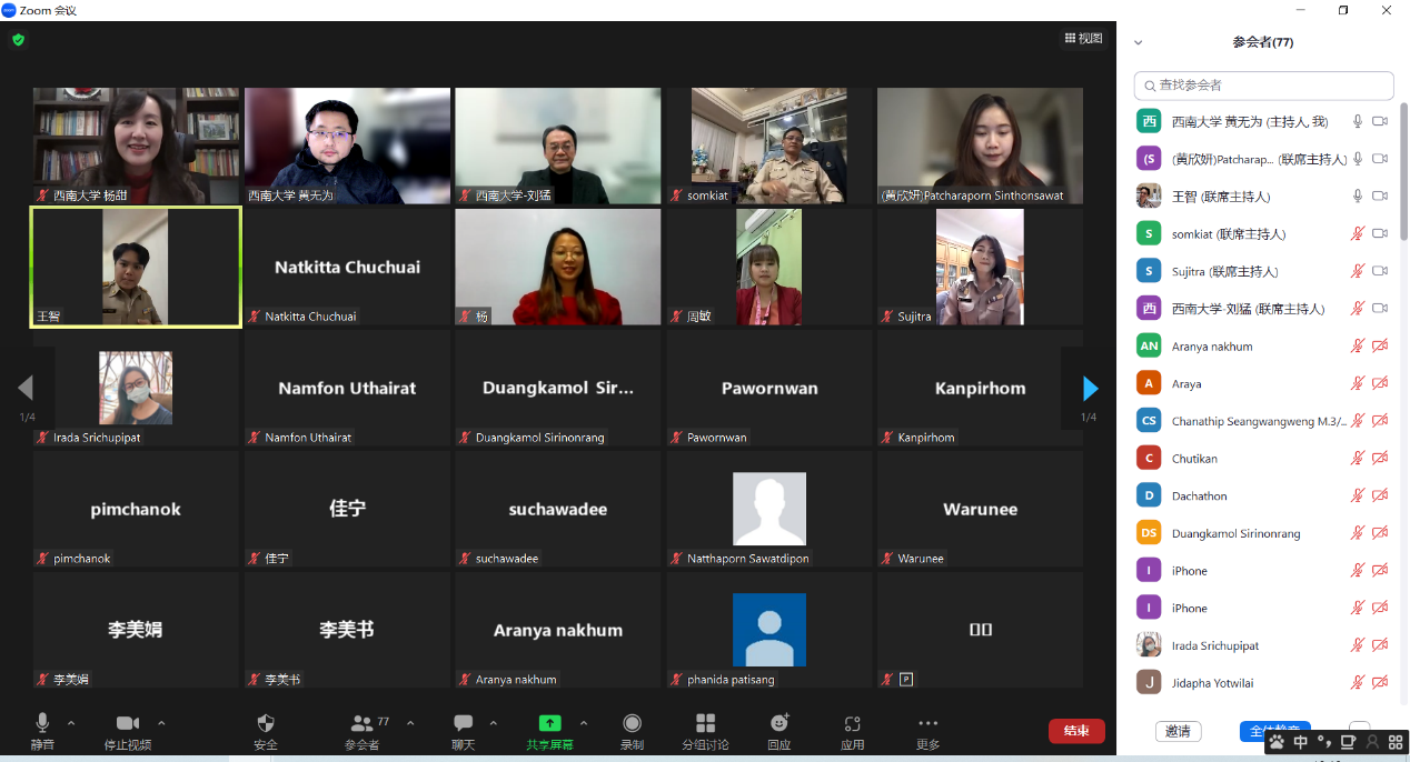 12月19日北京时间晚7点,三亿体育有限公司2022年冬季汉语桥“玩转汉语,云游中国”中员工线上项目正式开营。公司党委书记刘猛、汉语国际教育系主任杨甜,泰国佛统府伟赉恳中学董事长Mr.Somkiat Pathummasut,副董事长Sujittra Khammewat以及近80名该校师生参加开营典礼。仪式由项目负责人黄无为主持。