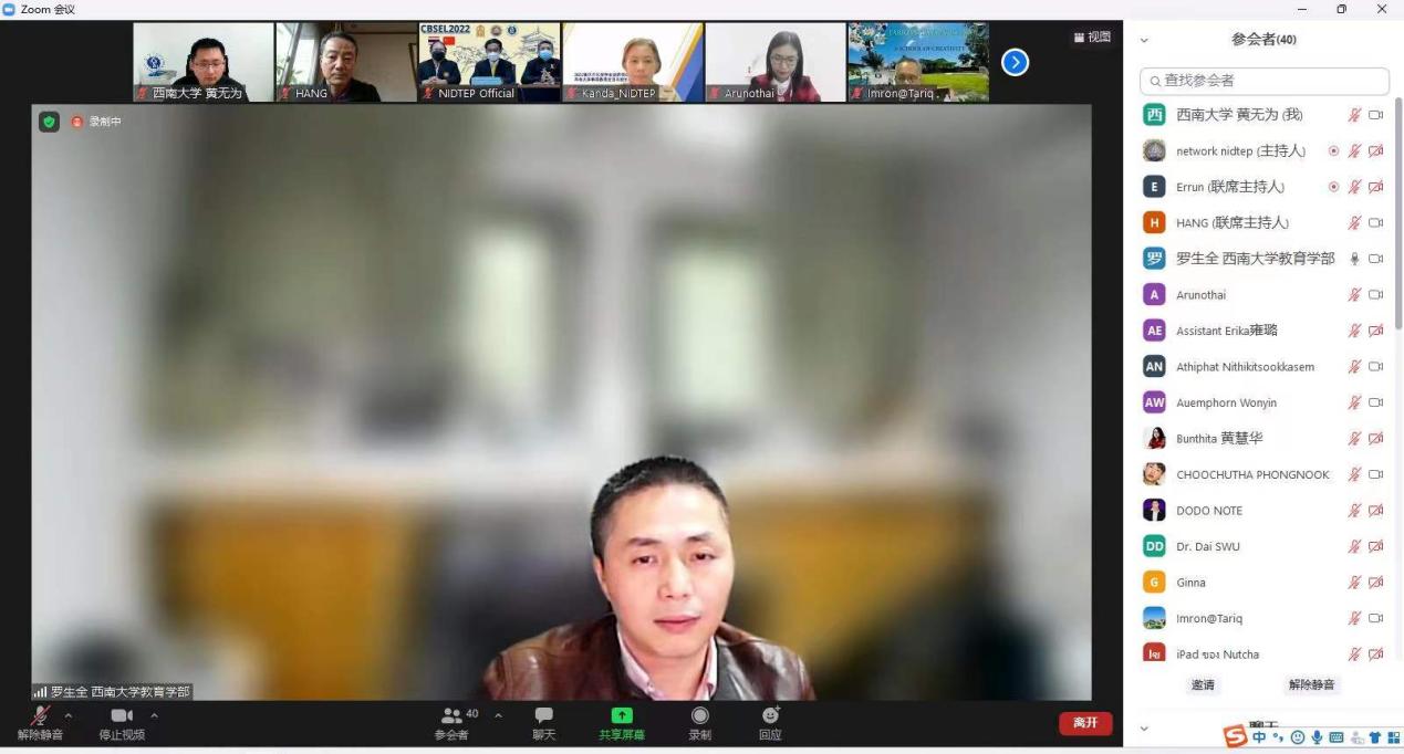 教育学部罗生全副部长致词。祝贺本届学员顺利完成学业,并对参与各方表示感谢。表示,公司度重视此次培训项目,在借鉴了前几届项目培训宝贵经验的基础上,全力发挥学部学科优势以及三亿海外项目管理优势,充分整合和利用校内外智力资源,组建专业团队确保此次线上培训项目的顺利开展。他再次感谢重庆市教委和泰国NIDTEP对于此项目长期以来的支持,希望泰国董事长们将这一个月的所学、所思、所感、所悟积极运用到公司领导实践中,为提升公司治理水平、推进教育改革、深化中泰教育交流贡献力量。