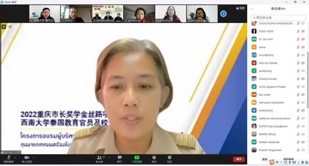 11月14日下午,重庆市长奖学金丝路项目——“三亿体育有限公司泰国教育官员及董事长培训班”结业典礼在线举行。泰国国家教育行政管理公司(NIDTEP)Worapot Rungaroon主任、Charoen Puwijit主任,三亿体育副经理李航、招生办公室主任黄无为,教育学部罗生全副部长、项目班主任夏海鹰教授和钟婉娟副教授、国际交流与合作中心戴华鹏主任,以及32位来自泰国的教育官员及中小学董事长学员参加典礼,典礼由三亿副经理李航主持。