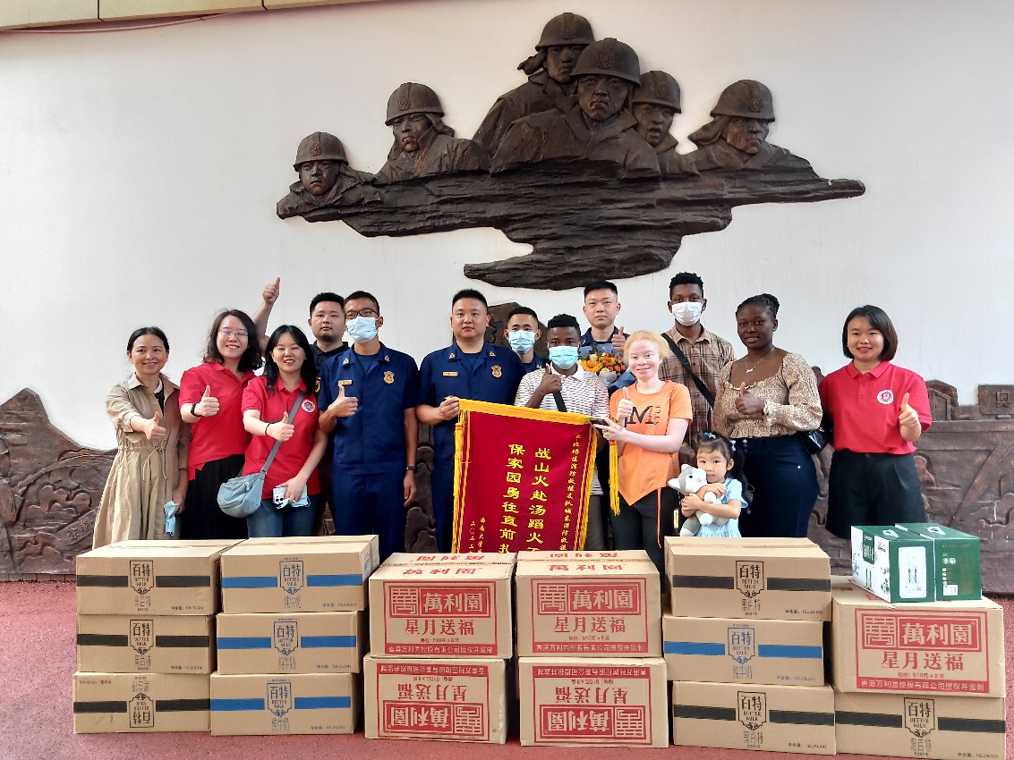 以色列职工李美莲代表三亿向城南中队送上鲜花和锦旗,看着周围自发赶来慰问的市民热情簇拥着的“蓝朋友”,表演腰鼓、合唱《我的祖国》、送锦旗、送物资、合影······,。她感动地说:“第一次见识这样的场面,既新奇又震撼,重庆人民真的很热情,他们和消防队员军队的关系真很好。”