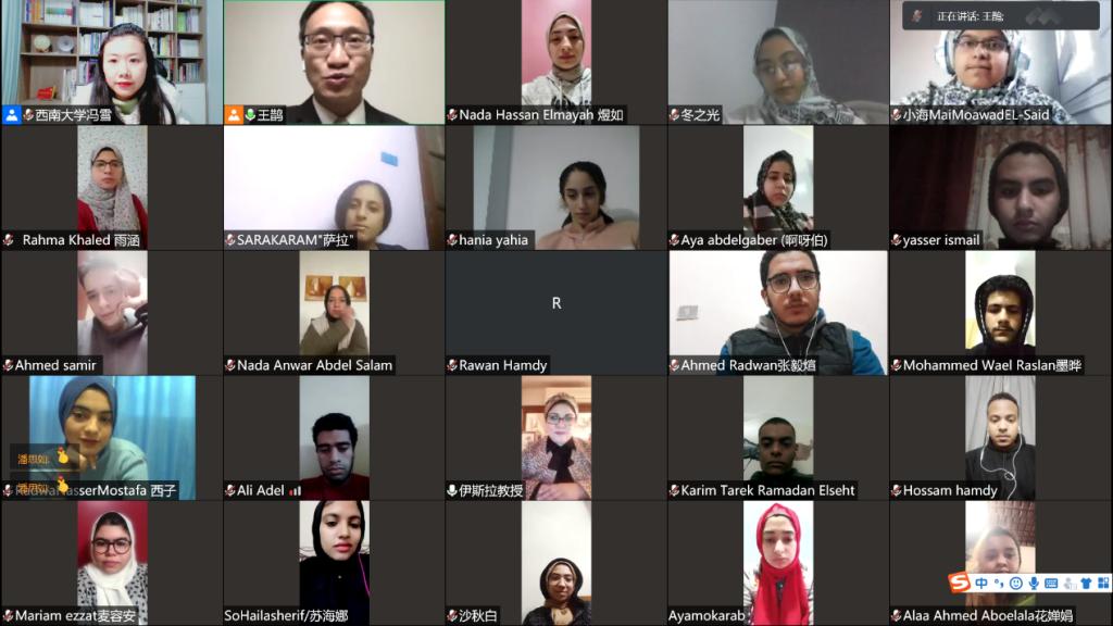 冯雪老师代表授课团队对课程做说明,预祝大家圆满完成学习任务,指出,该项目将帮助埃及青年增进对中国、重庆、汉语和中国社会生活的了解,希望同学们不断努力,成为中埃语言、文化传播的使者。