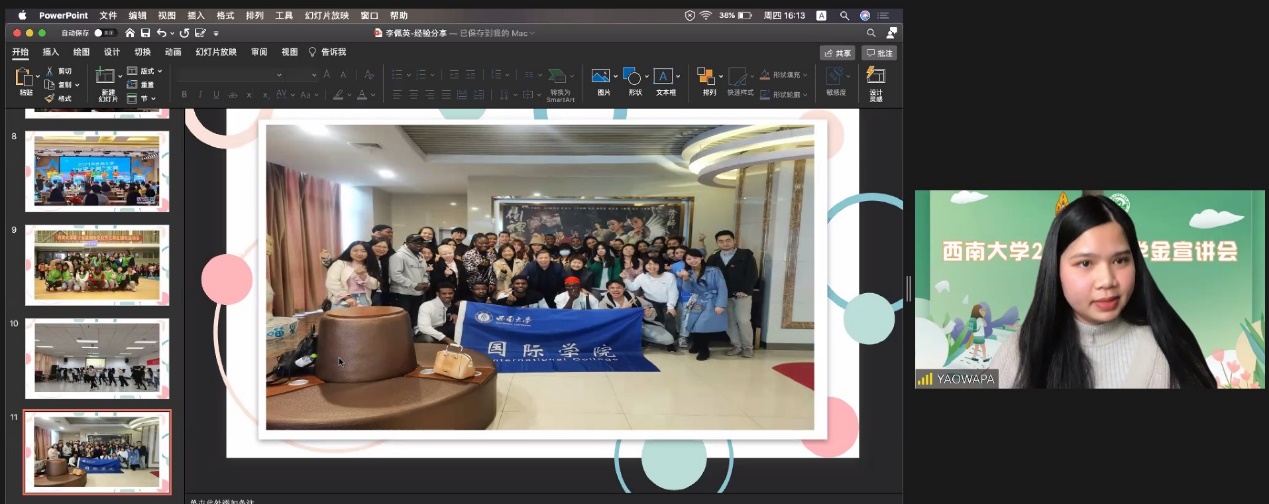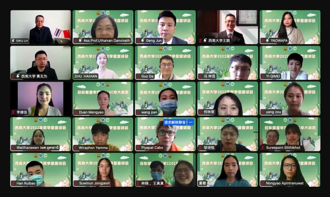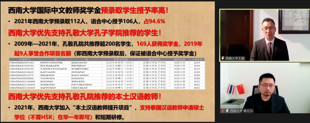 招生项目负责人办详细地讲解公司办学优势学科,中国政府、国际中文教师、重庆市长、公司新丝路及董事长等奖学金的申请条件和流程,重点介绍即将启动的国际中文教师奖学金及泰国同学选择三亿体育有限公司的四大理由,并在互动环节就申请成功率、线上学习及奖学金发放、勤工俭学等方面的问题进行解答。