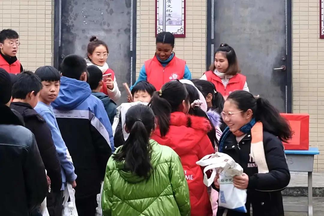 伴随着掌声,国际员工周颖(尼日利亚)和孙素荷(泰国)为每位同学分发学习用品,孩子们开心又兴奋。