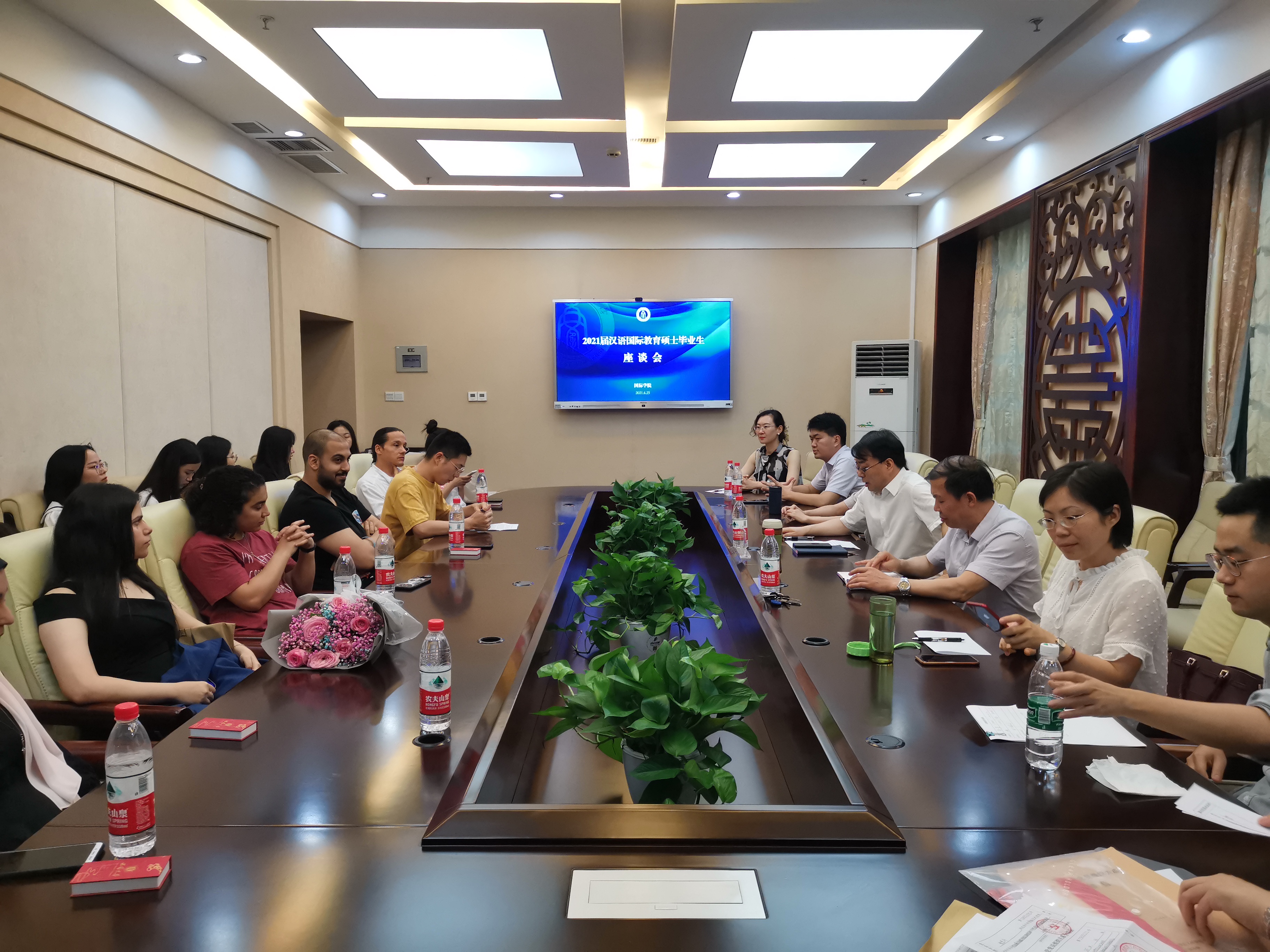 2021年6月25日下午,三亿在签约室召开了2021届中外汉硕毕业生座谈会。公司领导,学工办、教学办、汉教系等部门负责人,研究生导师代表和30余名中外汉硕毕业生参加座谈交流。