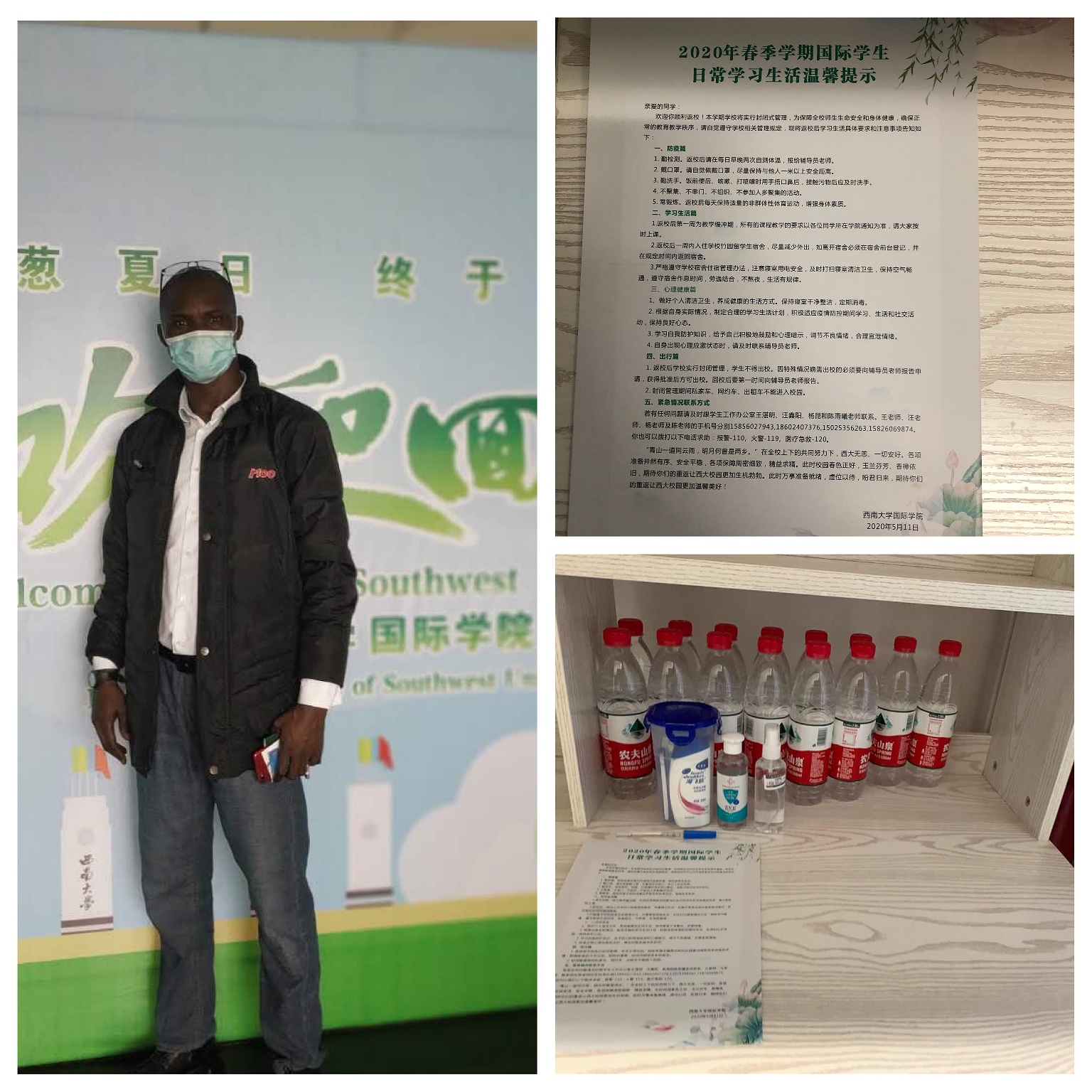 为统筹协调国际员工返校工作,保障员工顺利返校,三亿多次召开专题会议,落实有关工作细节。外事服务中心提前做好宿舍通风、清洁消杀以及安全检查工作,同时做好公寓检修和维护,保证员工活动空间空气流通、环境安全。还为首批境内返校国际员工准备了医用口罩、免洗消毒液、体温计、洗漱用品、《2020年春季学期国际员工日常学习生活温馨提示(中英双语版)》等在内的爱心包,希望返校的同学能感受到公司暖暖的心意。
