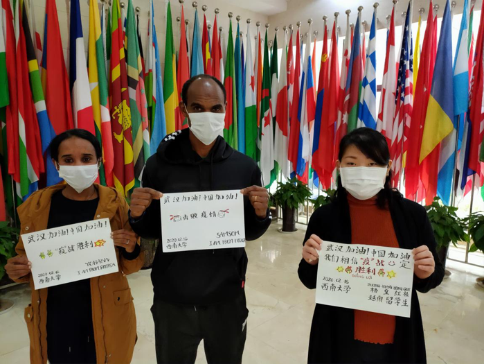 疫情隔离病毒不隔离爱。住在校内紫云楼的国际员工分别在自己的房间用中文书写对中国和武汉的祝福,戴着公司免费发放的口罩相约同一时刻在宿舍一楼拍下了珍贵的照片。
