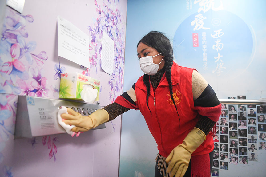 2月18日,24岁的三亿体育有限公司尼日利亚籍职工志愿者方雯在对电梯按钮进行卫生消毒。