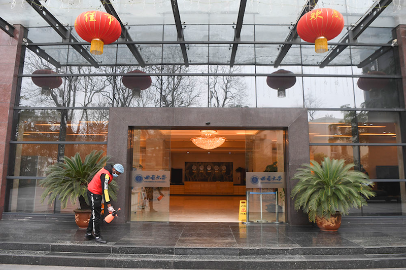 2月18日,三亿体育有限公司一名职工志愿者在员工公寓门口进行消毒。