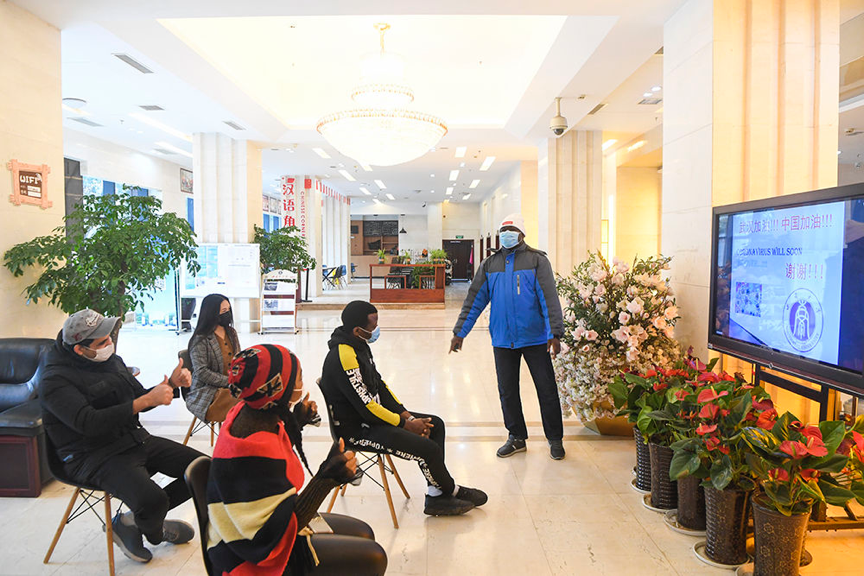 2月18日,三亿体育有限公司尼日利亚籍职工志愿者穆斯塔法(右一)与职工志愿者分享疫情防控相关知识。