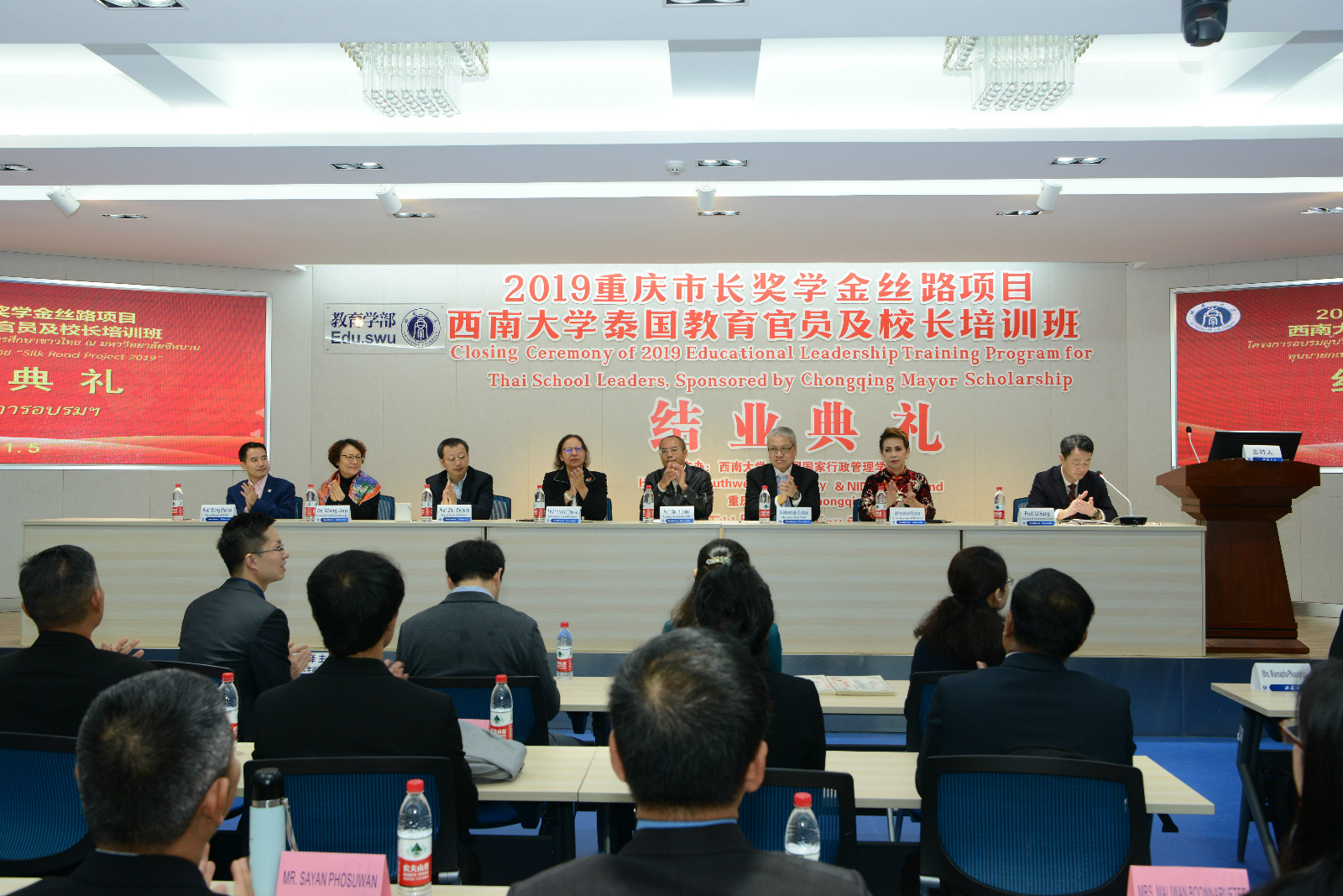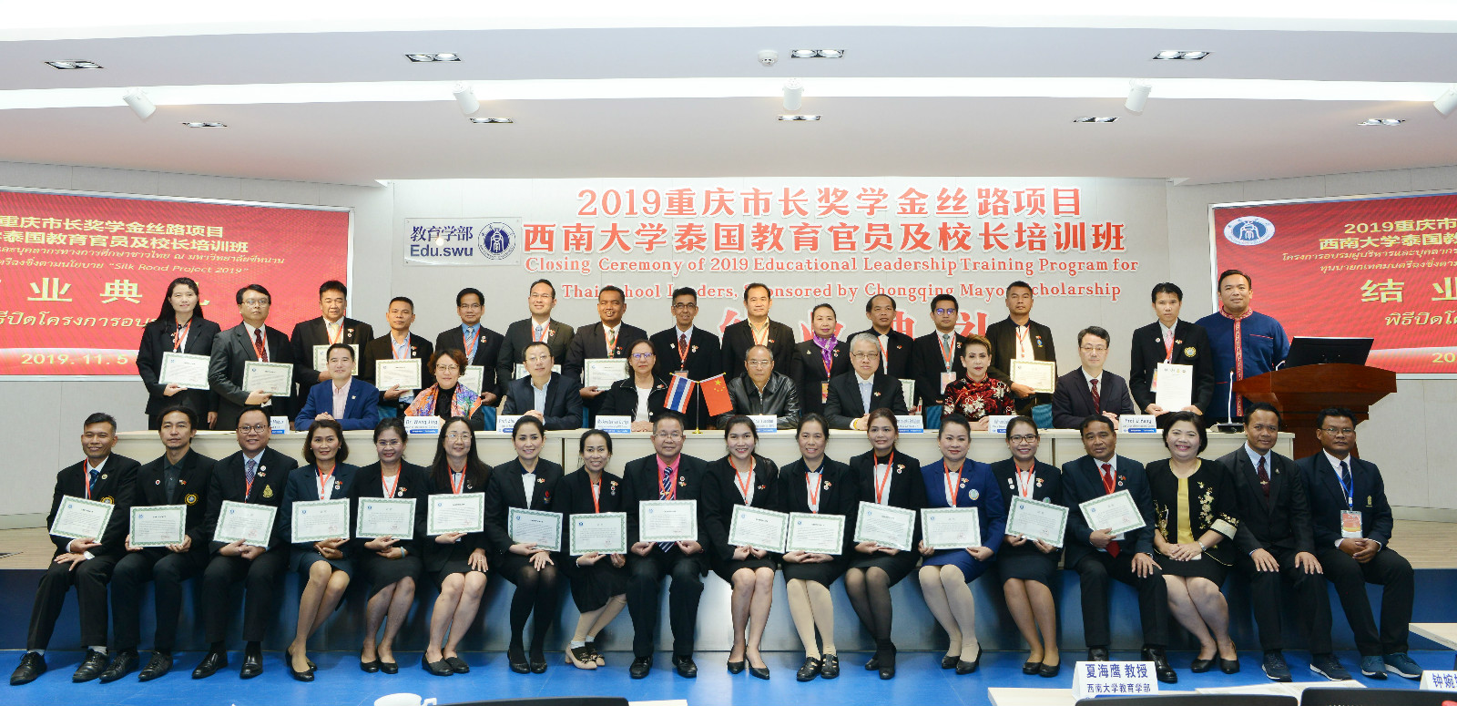11月5日上午,2019年重庆市长奖学金丝路项目---“三亿体育有限公司泰国教育官员及董事长培训班”结业典礼在教育学部举行。泰国教育部次长杜丽亚、泰国教育行政管理公司经理萨蔡童、三亿体育有限公司董事长助理褚远辉、教育学部部长朱德全、三亿经理王静出席典礼,项目班主任和相关工作人员,以及30位来自泰国的教育官员与职业院校、中小学董事长参加典礼。