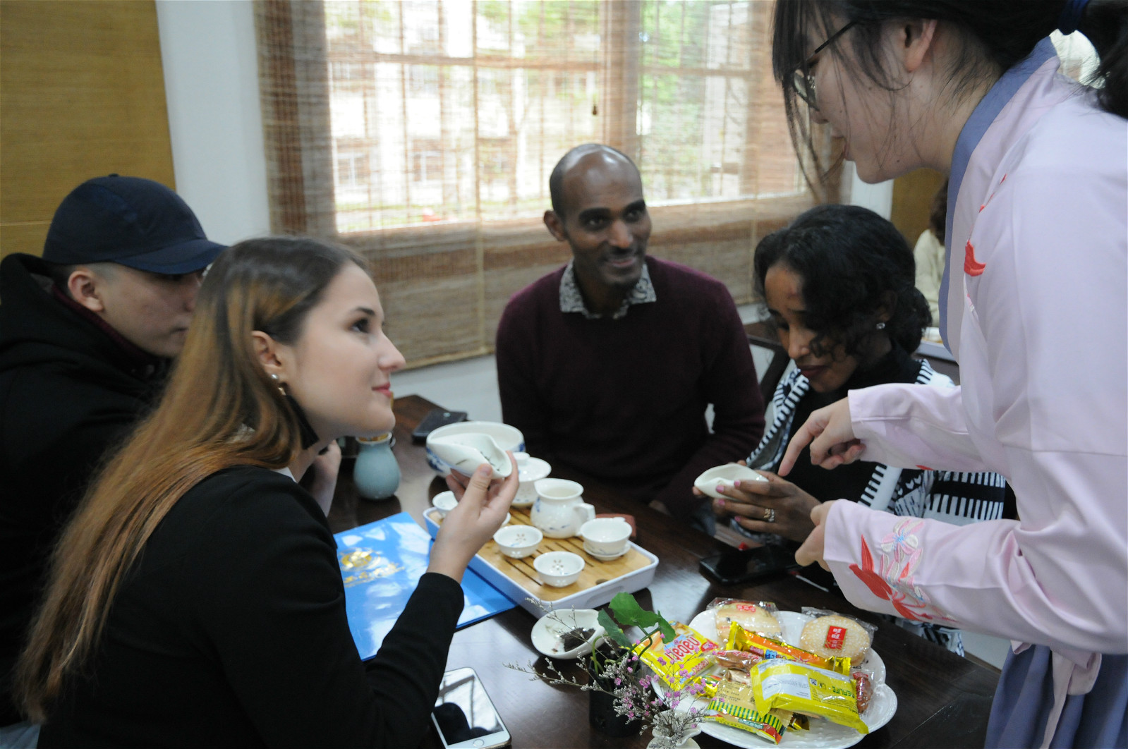 在观看了一段技艺精湛的茶艺表演后,国际员工们也都对沏茶跃跃欲试,在志愿者的帮助下,大家都纷纷开始体验制茶的过程。