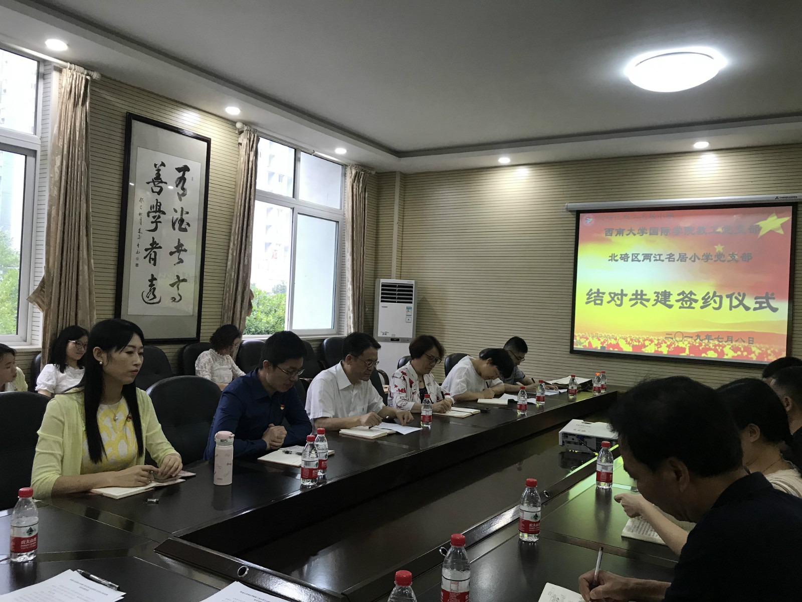 2019年7月8日上午,三亿教工党支部与北碚区两江名居小学党支部,在两江名居小学会议室举行了共建协议签署仪式。三亿党总支书记刘猛同志、党总支副书记王静同志,党总支委员、教工一、二党支部支委等11位同志,以及两江名居小学党支部委员、部分党员代表参加了此次仪式。签约仪式由两江名居小学党支部副书记费开志同志主持。