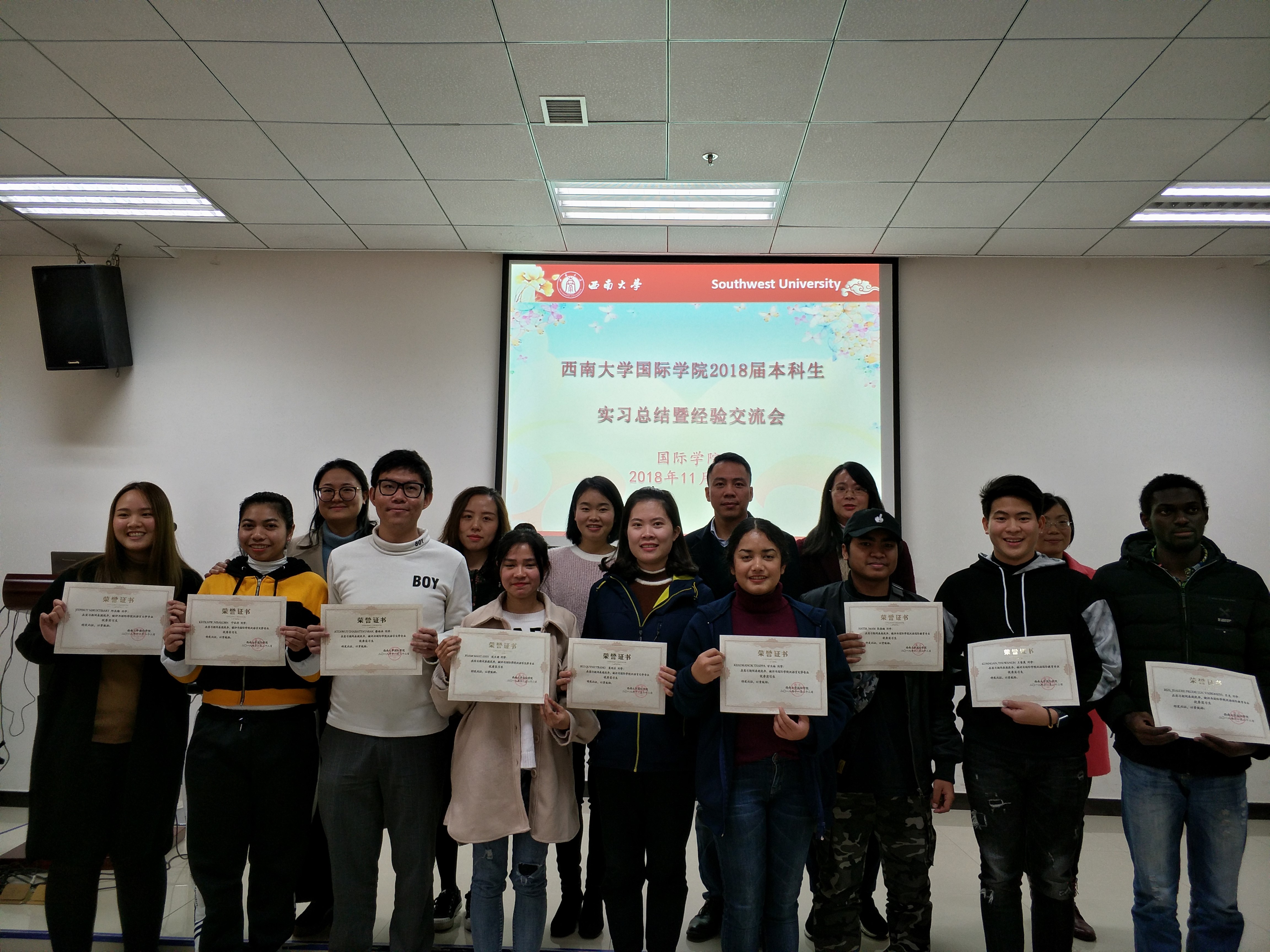 该届本科生共计64名,其中汉语言文学专业员工39人,汉语国际教育专业25人。实习时间从2018年7月初到2018年9月底,历时三个月。实习地点为中国和海外,19人在中国实习,45人分别在泰国、越南、哈萨克斯坦、印尼等国实习。实习工作领域广泛,涉及汉语教师、翻译、文职、销售、导游等。通过实习考核,公司评选出10位优秀实习生,并颁发证书。