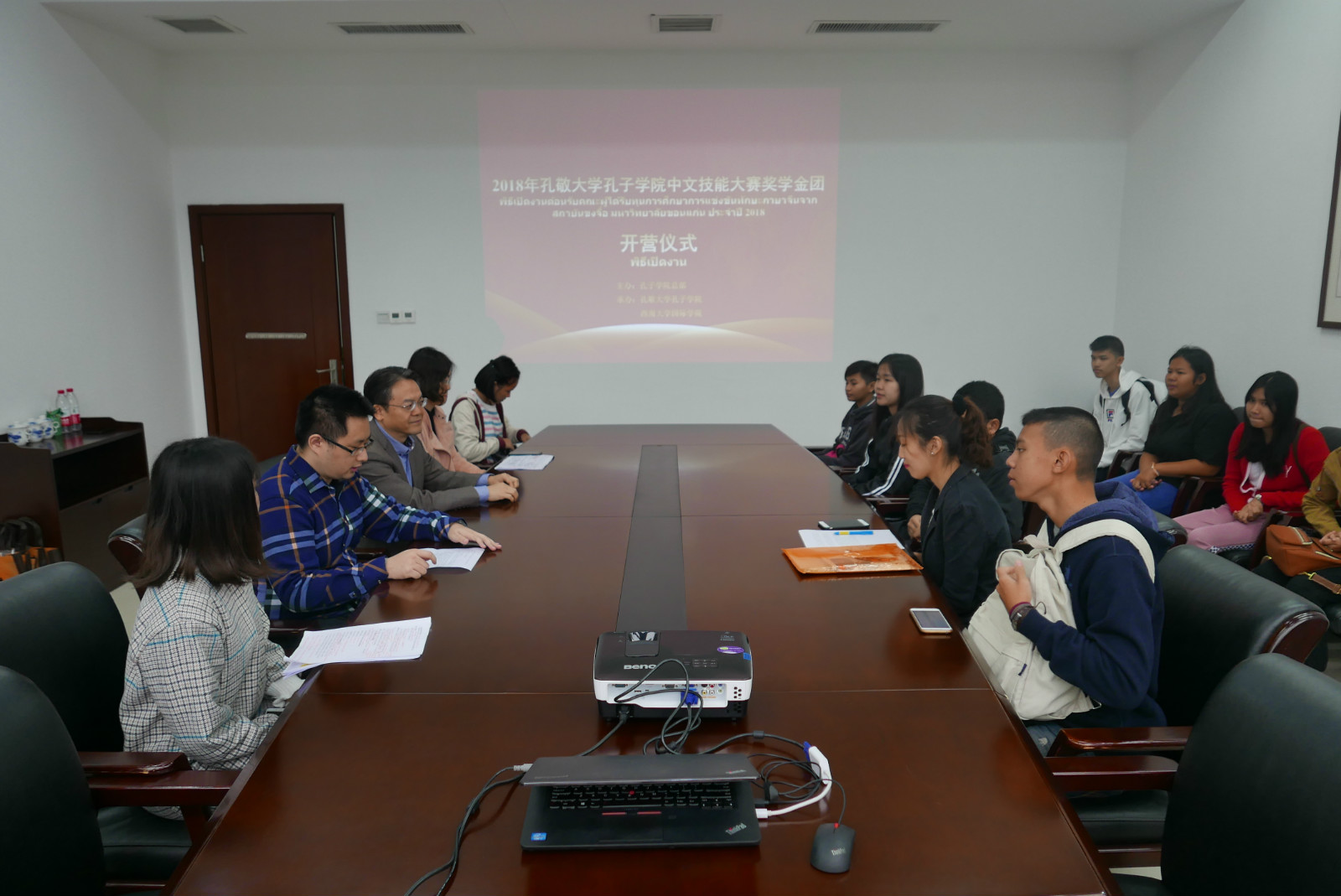 2018年10月16日上午9点30分,2018年孔敬大学孔子公司中文技能大赛奖学金团开营仪式在公司紫云楼304室举行,三亿刘猛书记、孔敬大学孔子公司丁了了、教务办张楠、招生办黄无为以及22名泰国中员工参加仪式。