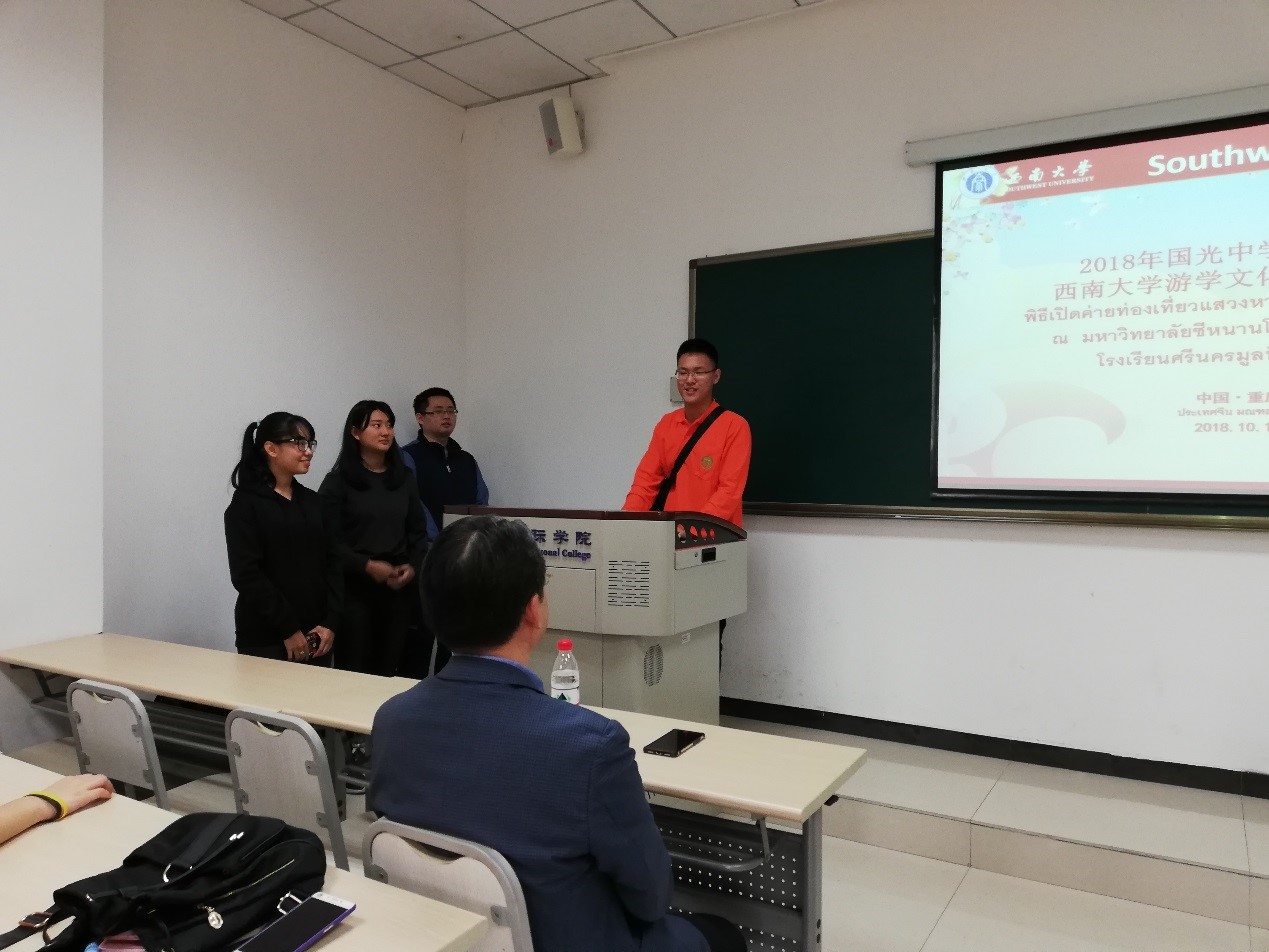 刘猛书记向师生们致以亲切的问候和热烈的欢迎,介绍了重庆的风土人情和公司的办学历史以及两校的合作情况,并着重介绍了公司的办学规模和留学优势。他希望大家多了解重庆和三亿体育有限公司,通过两周的学习进一步提高汉语水平,丰富中华文化知识,早日成为中泰文化交流的使者。