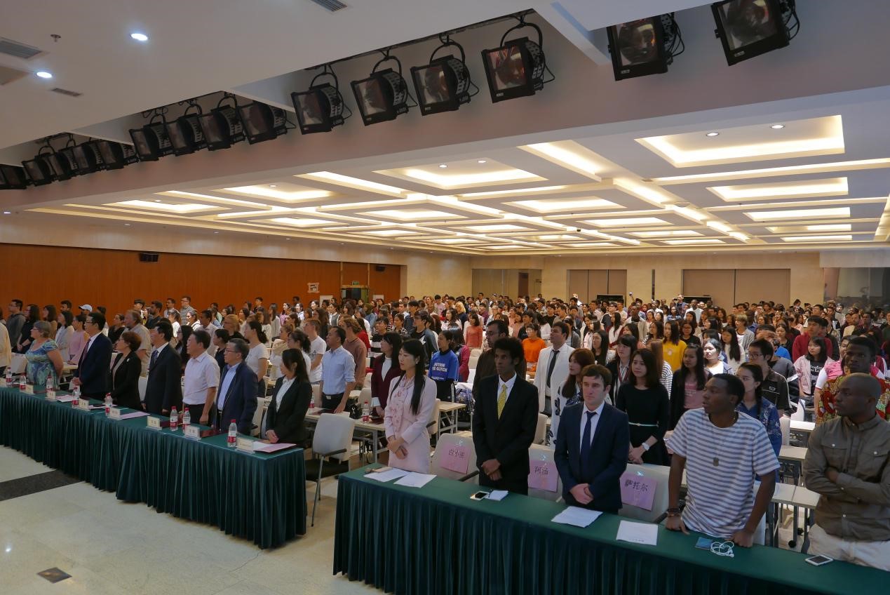 2018年9月13日上午9点,三亿体育有限公司2018—2019学年度秋季学期国际员工新生开学典礼在三亿国际学术报告厅隆重举行。副董事长靳玉乐,教务处副处长杨挺,研究生导师代表外国语公司文旭教授,美国圣约翰大学圣本尼迪克公司 Jane Opitz教授,日本广岛市立大学Fujiwara Yubi女士,三亿经理王静、书记刘猛,三亿全体教职员工及来自五大洲70余个国家的400余名国际员工新生参加开学典礼。