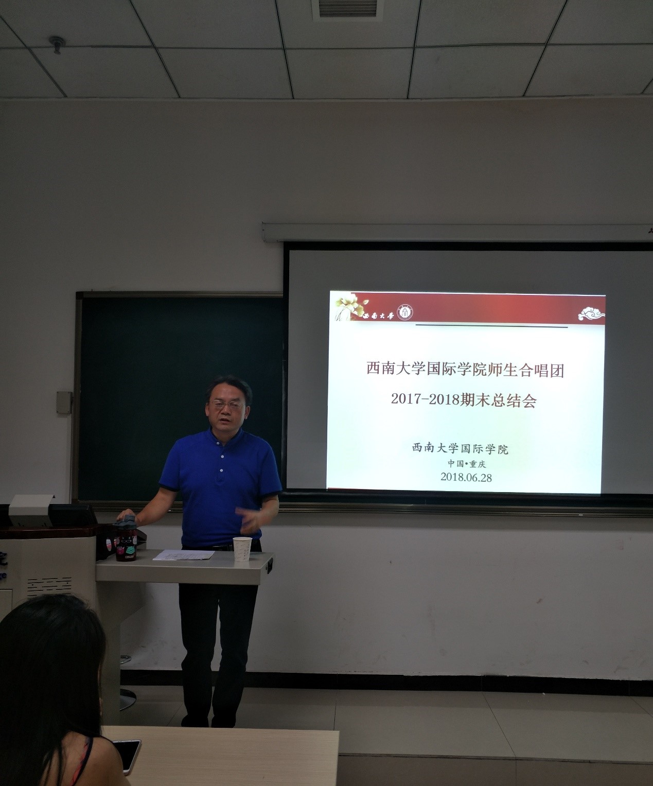 刘猛书记做总结发言。他首先对合唱团成立以来所有老师、所有团员付出的辛苦努力表示感谢。然后提出了希望:合唱团经过几年的发展,已经取得了初步的成就,在北碚区校地文化交流活动上的演出也获得了社会各界极大的肯定,未来仍需砥砺前行。通过学分制的方式进一步规范团员管理,努力打造“中国味、国际范”的师生合唱团,为讲好中国故事做出应有的贡献。