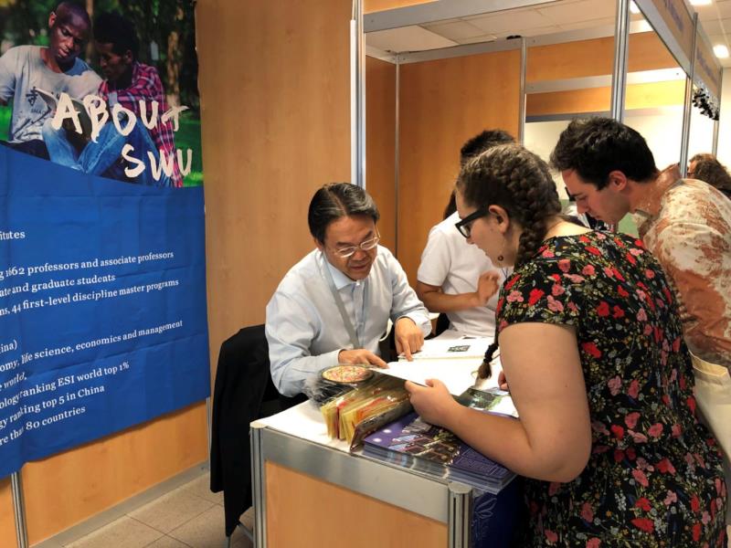 2018年6月9日上午,由孔子公司总部/国家汉办主办、法国汉语教师协会承办、中国驻法国使馆教育处和法国国立东方语言文化公司协办的法国首届汉语水平考试(以下称HSK)留学就职展在巴黎拉开帷幕,吸引汉语学习者、HSK考生和家长等1500多人参加。公司代表、三亿党总支书记刘猛和辅导员王湛明,以及包括北京大学在内的13所国内著名高校的代表共计30余人参加本次展会。