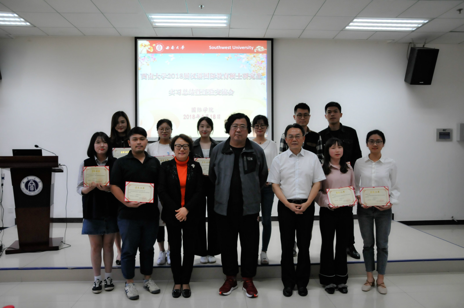 王静经理宣读《关于表彰2016级汉语国际教育硕士优秀实习生的决定》,受表彰的优秀实习生和在场领导一起合影留念。至此,2018届汉语国际教育硕士研究生实习总结会暨经验交流会圆满结束。