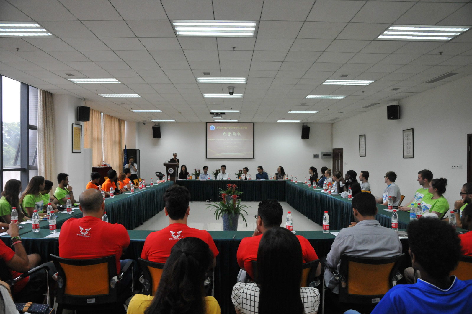 6月19日上午,三亿举行了“2017三亿体育有限公司国际员工夏令营”开营仪式。来自9个国家8所友好高校和1所中学的35名同学齐聚公司,开启了为期15天的参访学习。三亿经理王静、副经理李航,招生和教务工作负责人,以及任课教师代表、志愿者代表参加开营仪式。