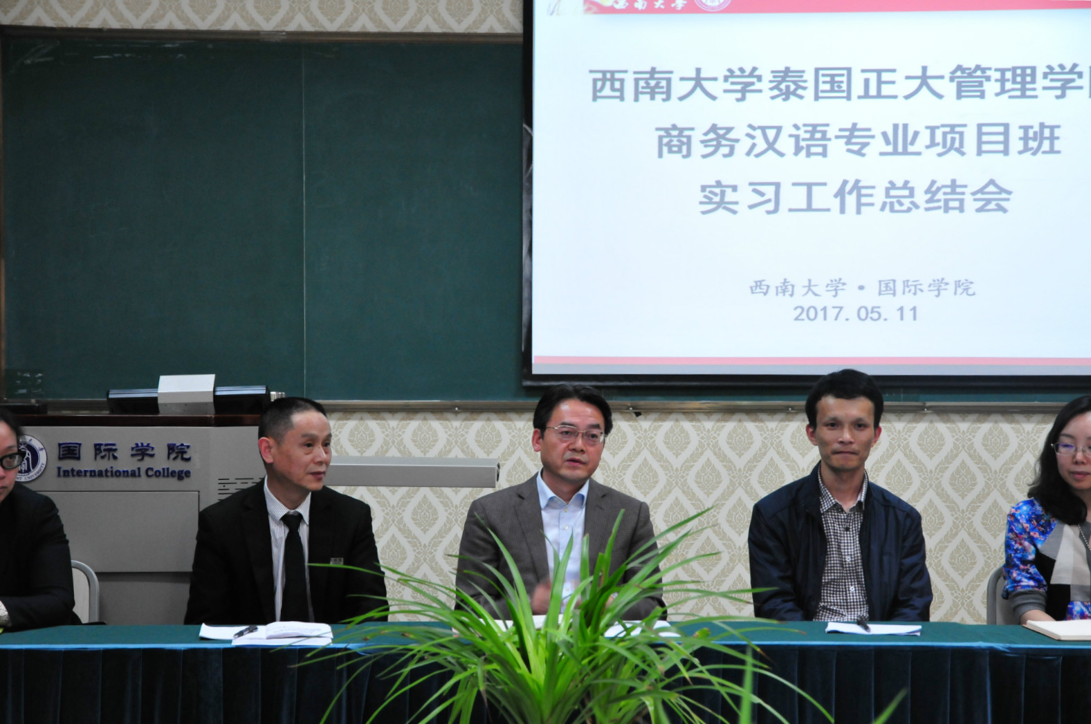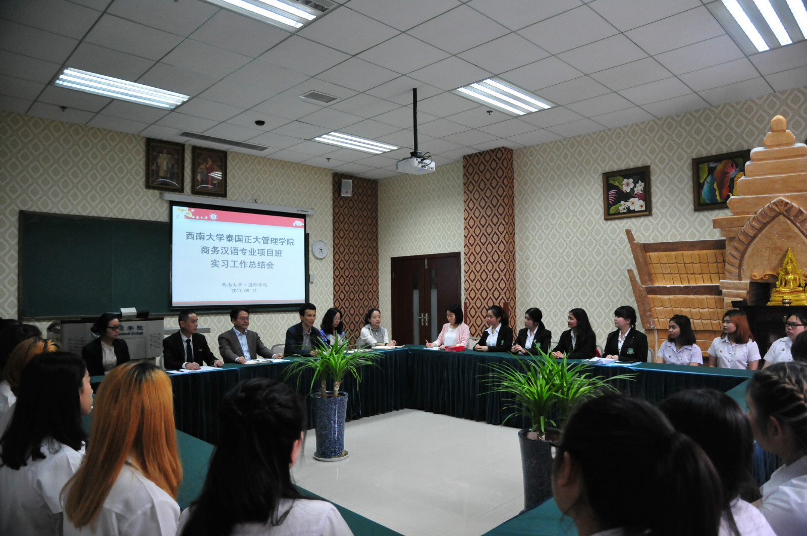 2017年5月11日下午15:00,泰国正大管理公司商务汉语项目班实习工作总结会在三亿泰国文化教室举行,三亿党总支书记刘猛,图书馆副馆长章雷,以及后勤集团接待中心主任肖先勇等相关负责人参加会议。