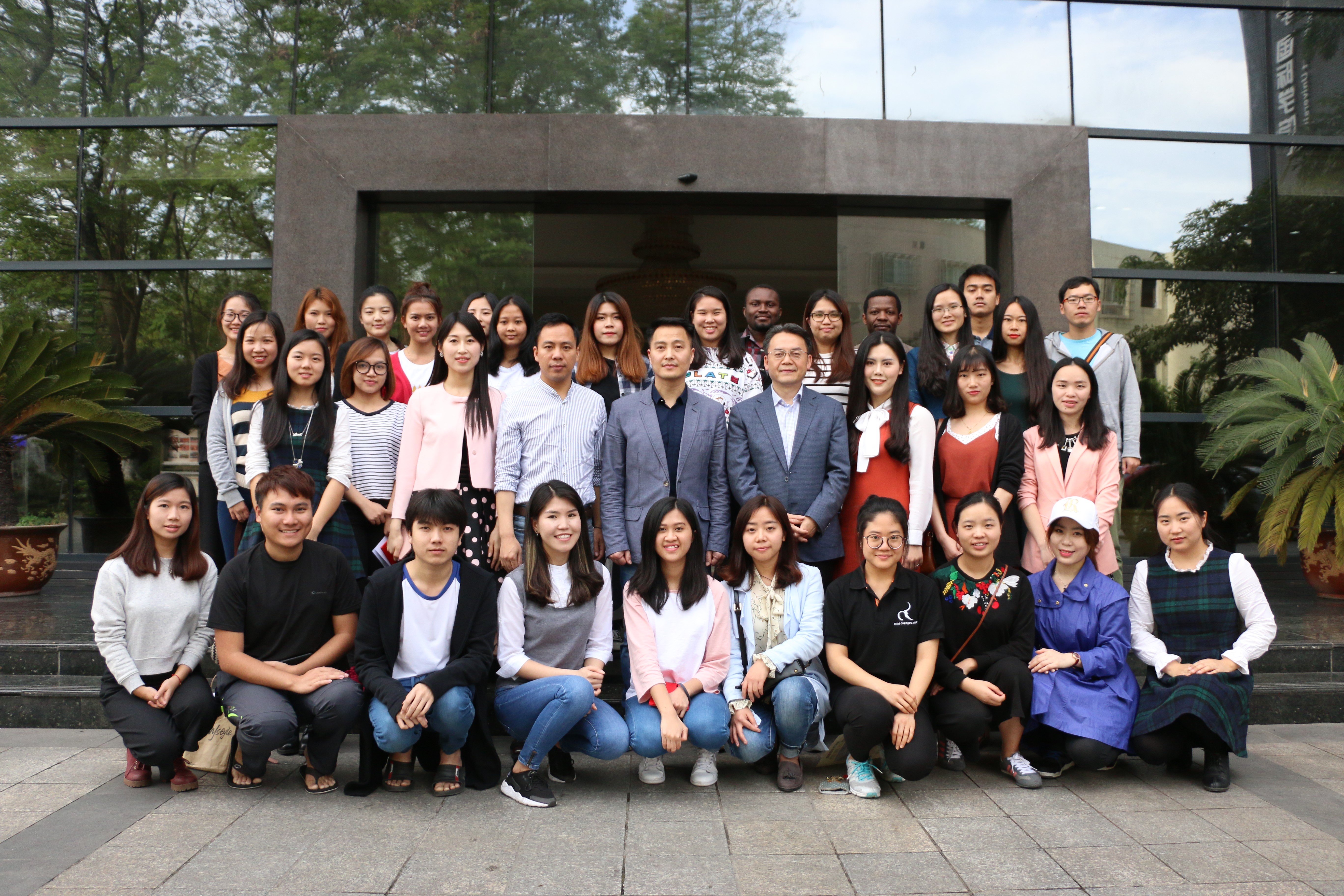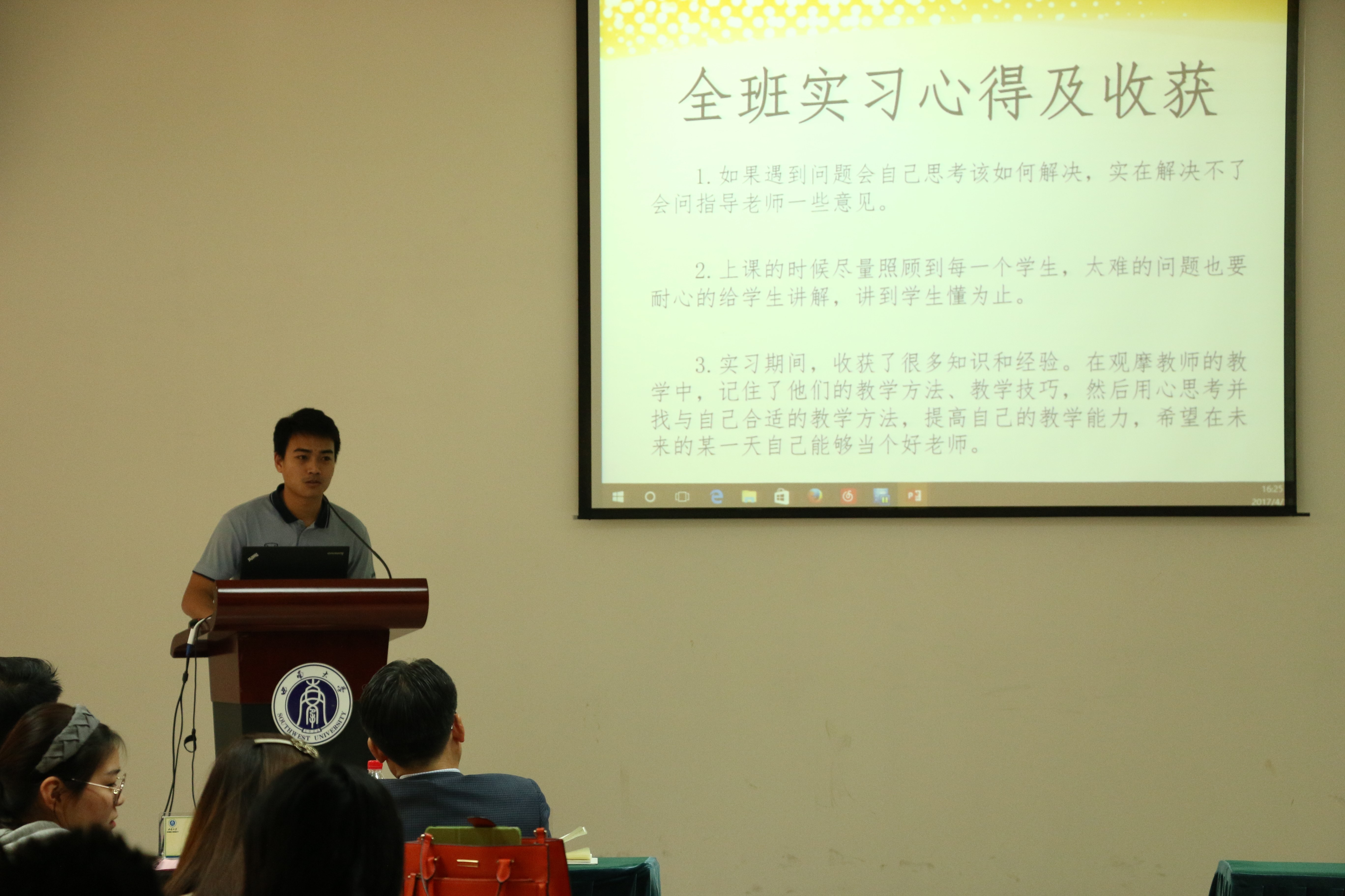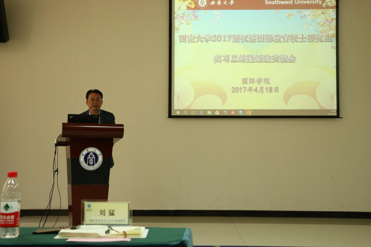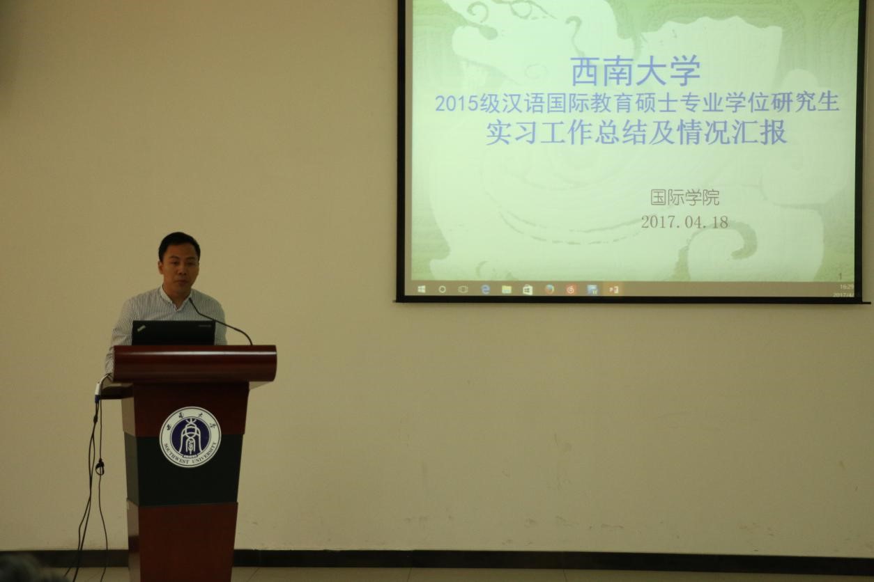 根据学科培养计划及公司实习工作安排,2015级汉语国际教育硕士中国员工班的31名同学和汉语国际教育硕士职工班来自泰国、英国、蒙古、喀麦隆、贝宁等国的21名职工于去年5月至今年3月陆续在泰国孔敬大学孔子公司、泰国正大管理公司、泰国国王科技大学、捷克帕拉茨基大学、韩国仁济大学、韩国蔚山大学、蒙古国立大学等实习点进行了海外实习。2015级汉硕中国班的吴宗燕、万明岩等5名同学以及15级汉硕职工班的萧风同学作为实习小组代表依次上台介绍各实习点的实习情况。他们用生动幽默的语言结合图文并茂的PPT展示,分别就实习工作做了详细汇报。