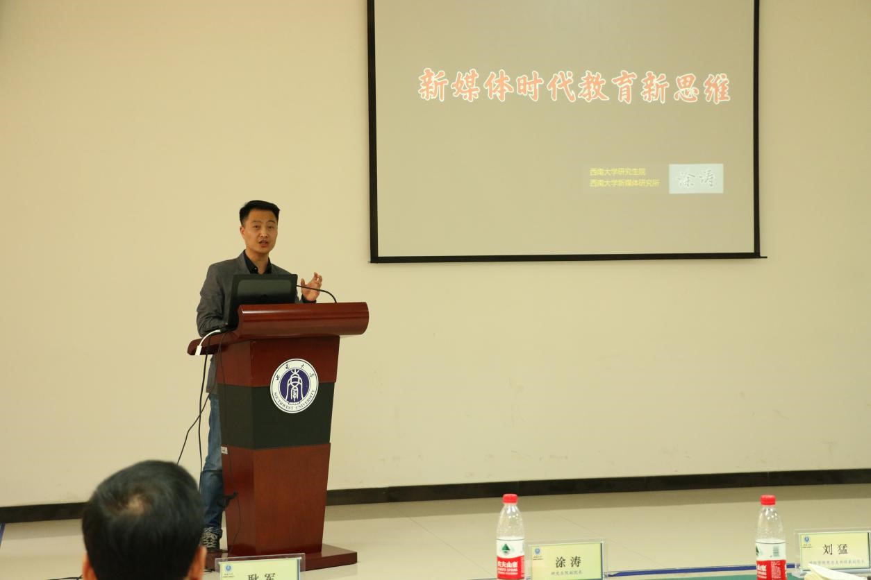 研究生院副经理涂涛做了精彩发言。他表示公司研究生院将全力支持汉语国际教育海外实习基地建设。随后他对“新媒体时代教育新思维”做了一个简单阐释,希望同学们能够以科学严谨的态度对待教学实习工作,能够结合新媒体有效地开展汉语教学。