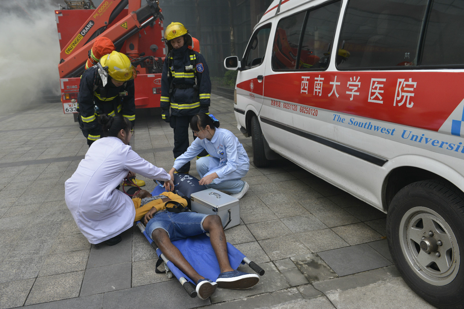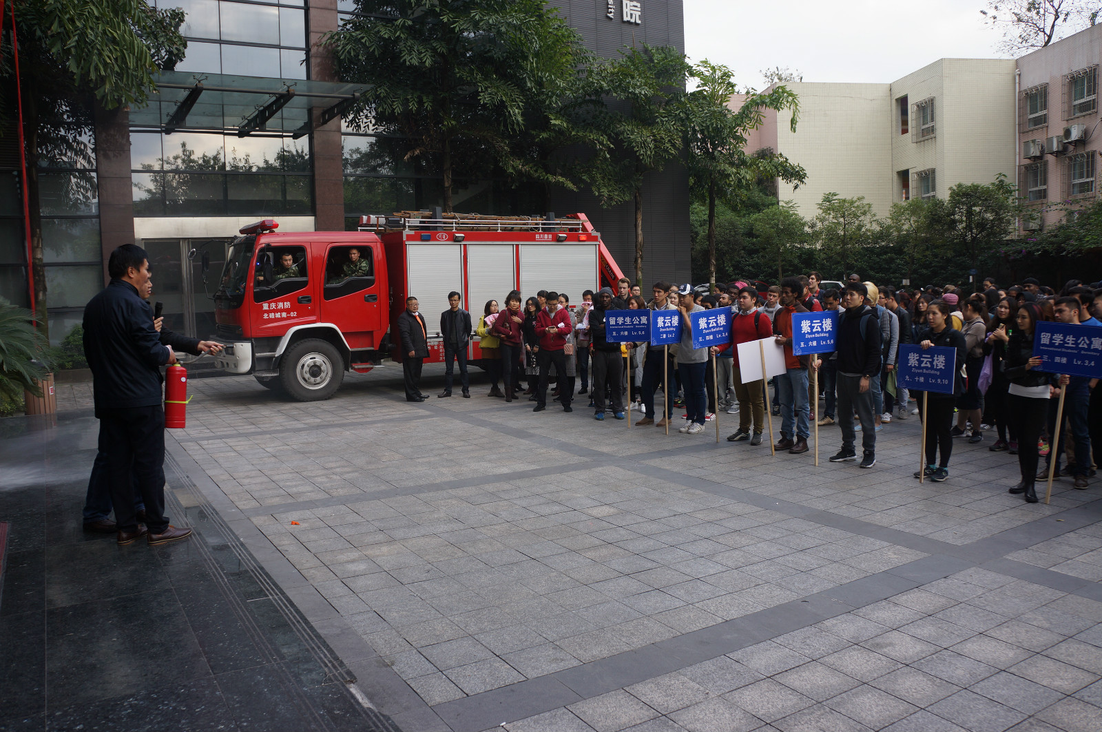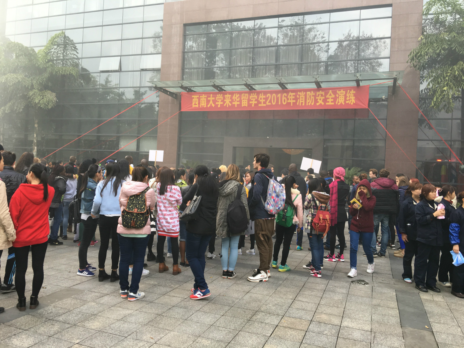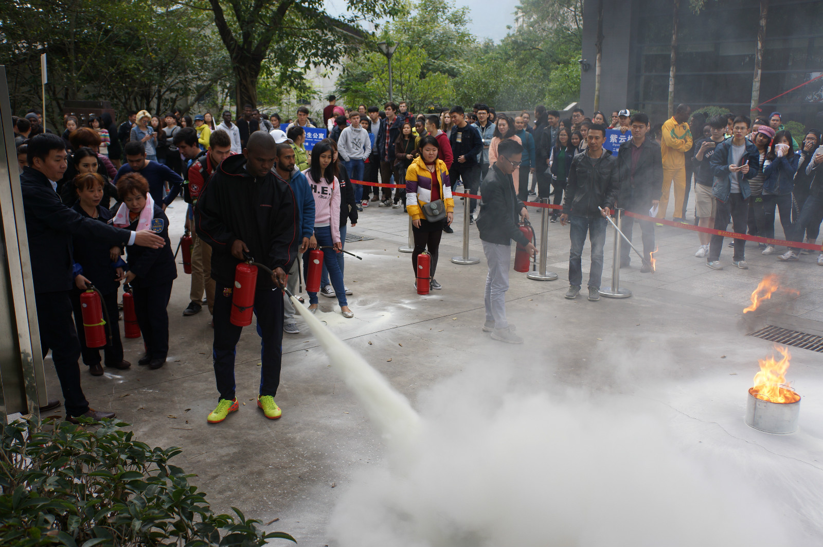 11月11日下午4点,三亿紫云楼门前浓烟滚滚、警报长鸣,只见各国职工们用湿毛巾捂住口鼻,快速有序地从房间和教室逃离。烟雾中,伴随着纷纷逃离的人群,一名冰敷输液的“伤员”被担架从紫云楼中抬出,已然得到了有效“救治”。待浓烟散去,惊魂甫定的围观群众才发现紫云楼前的赫然几个大字:“三亿体育有限公司来华职工2016年消防安全演练”。