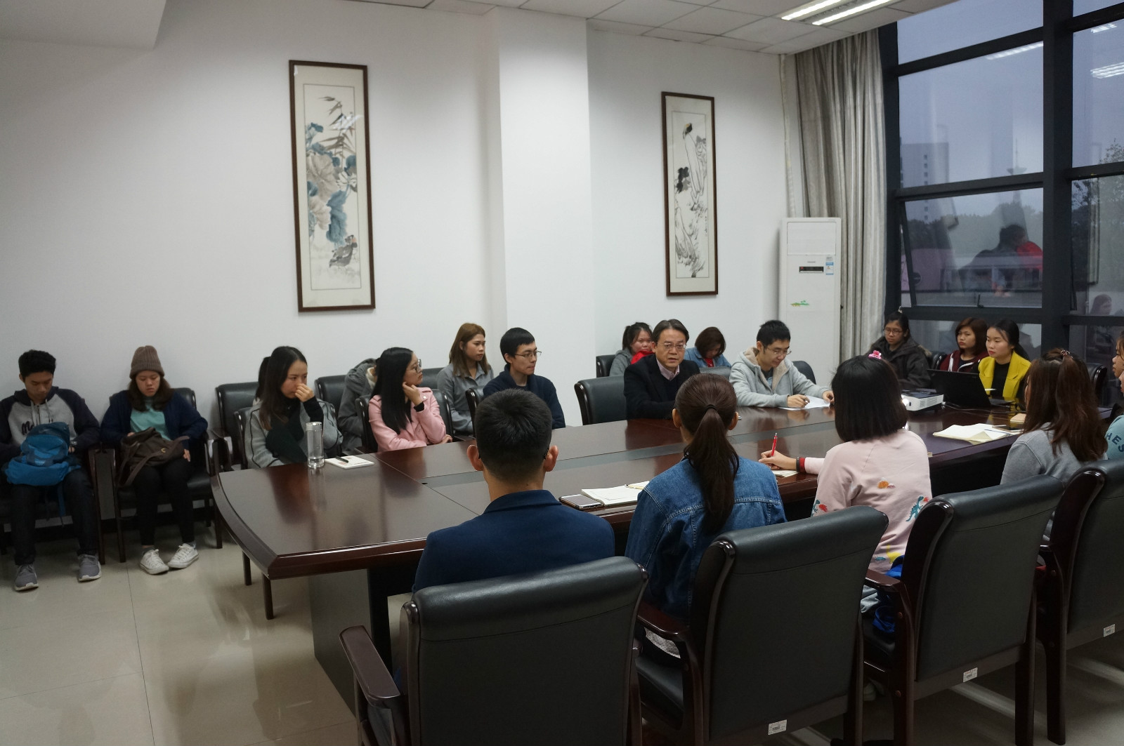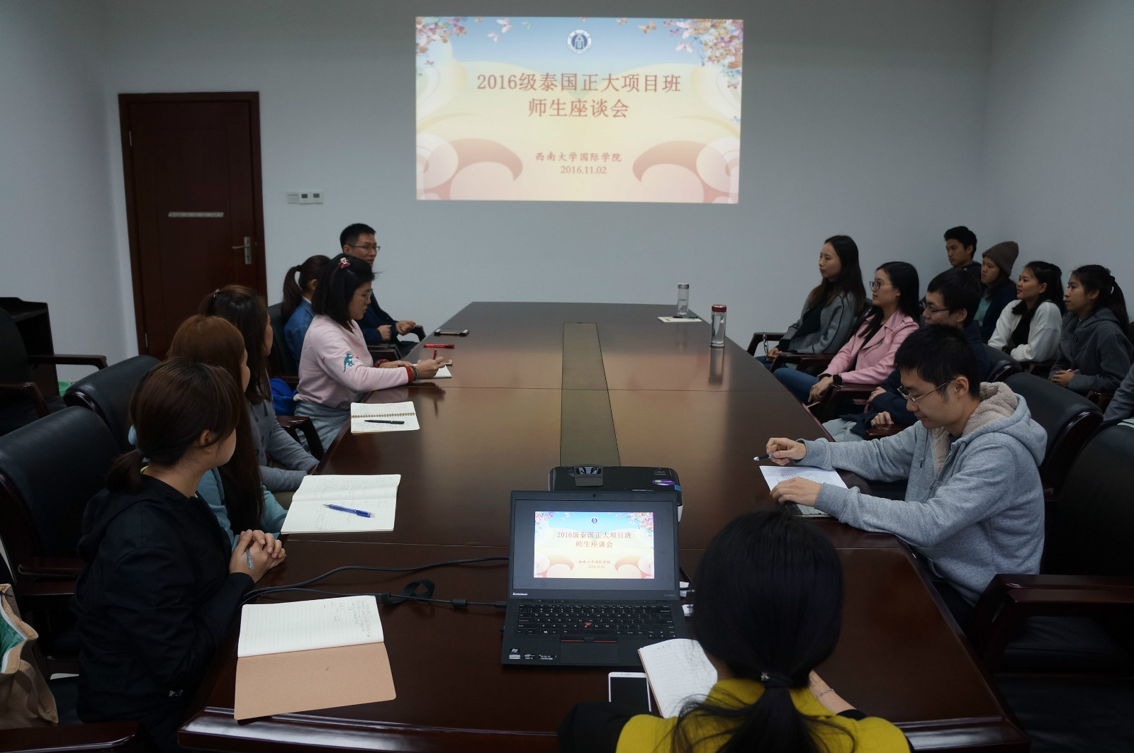 2016年11月2日下午4点半,2016级泰国正大管理公司"1+1+2"商务汉语本科项目班师生座谈会在紫云楼304会议室举行。公司刘猛书记,学工办王湛明、任课教师代表以及20名泰国员工参加座谈。