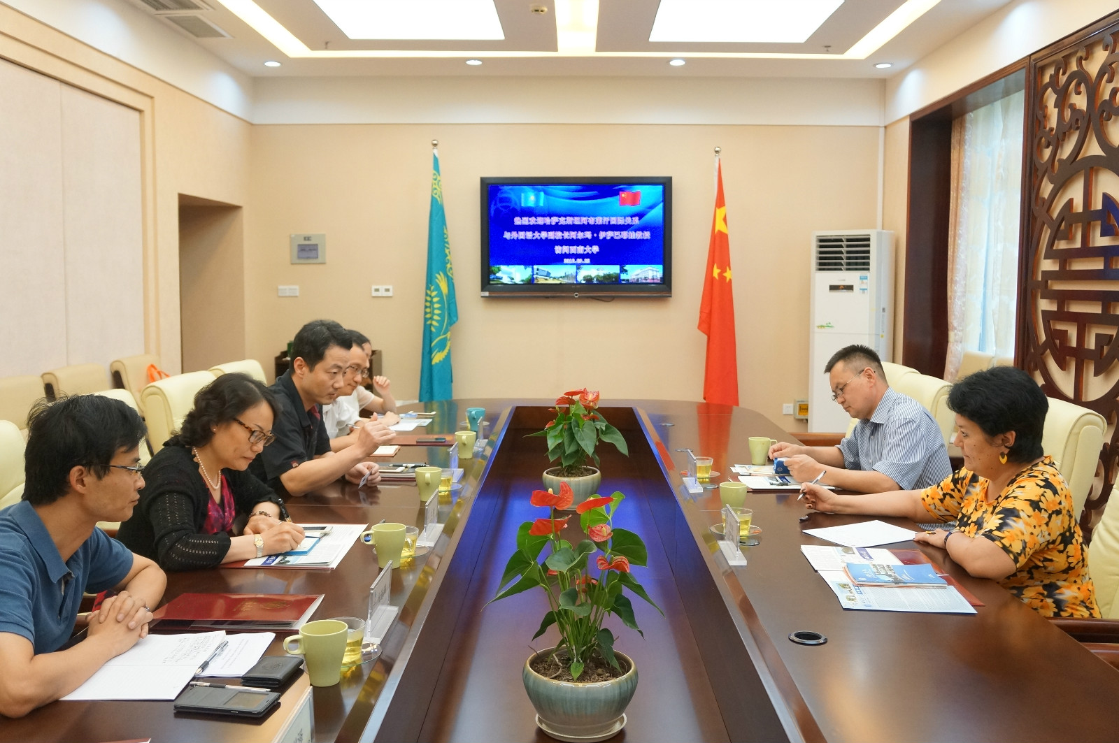 双方首先就两校共同申报阿布莱汗大学孔子公司工作进行了回顾,对孔院建设充满信心。随后,李航副经理详细介绍了公司工作内容和招生政策。最后,双方就“1+3”或“2+2”方式共同培养阿布莱汗大学汉语专业本科员工、长短期交换生、汉硕实习等项目深入探讨,商定合作时间表。