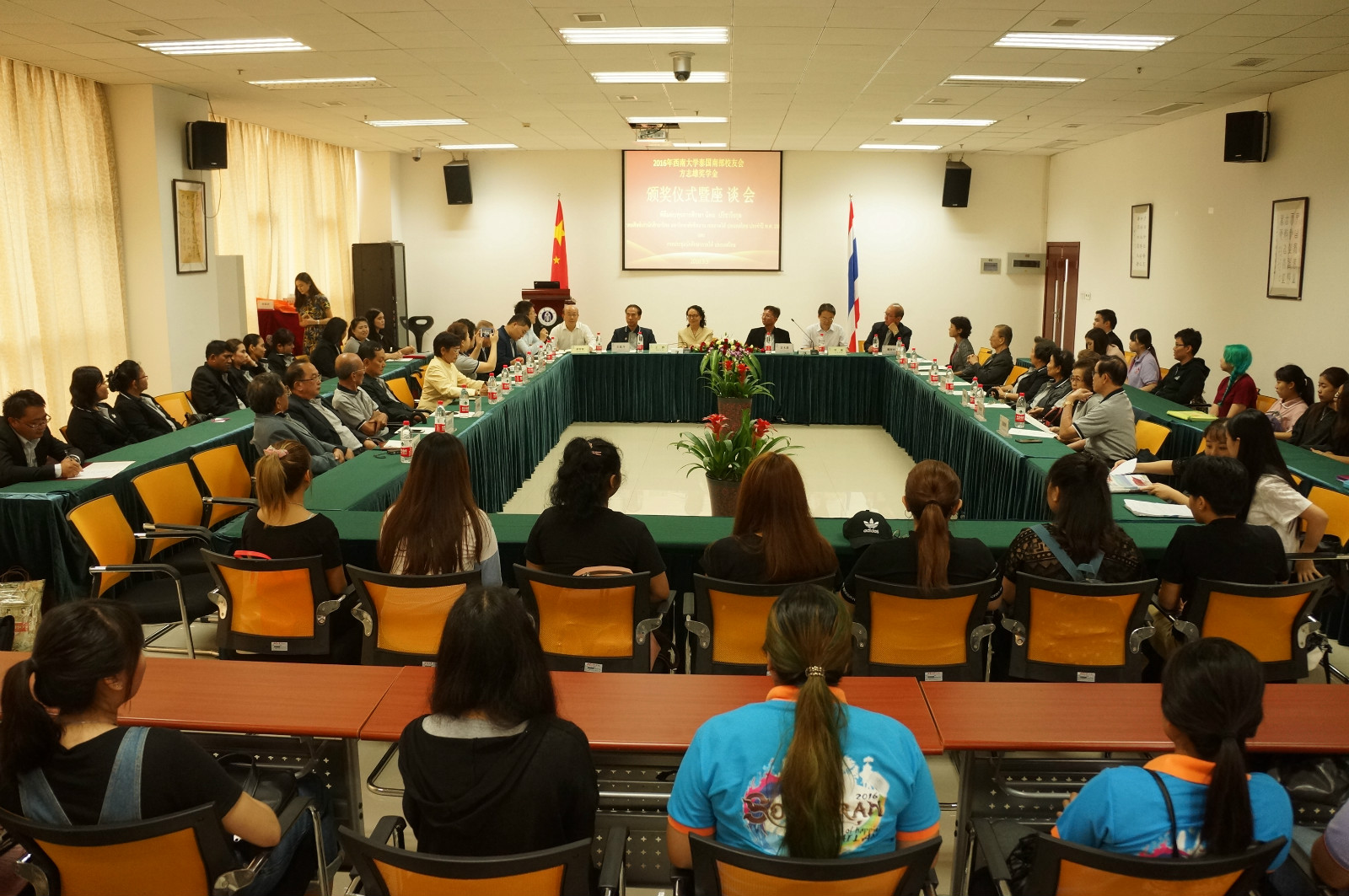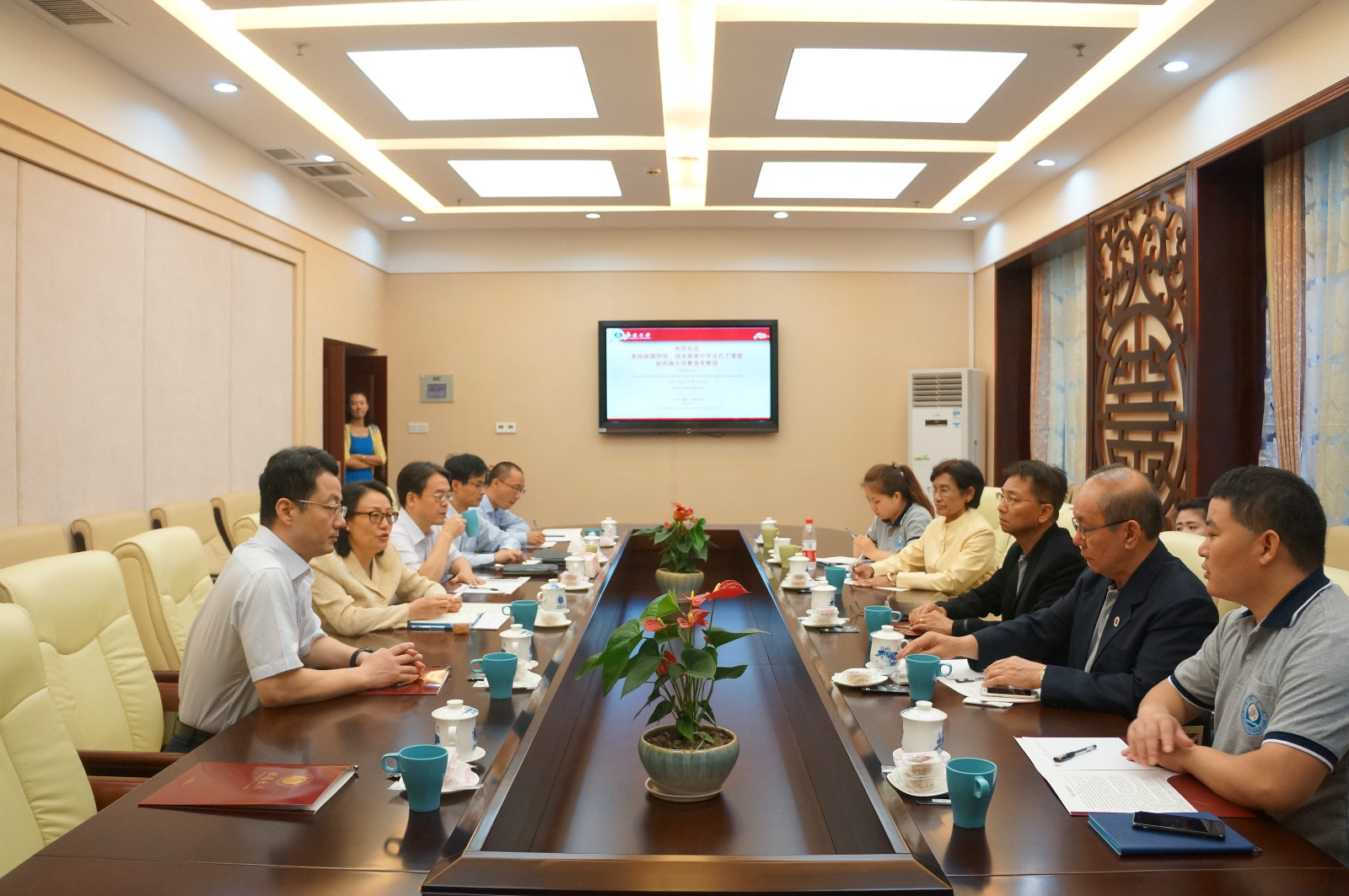 欢迎会结束后,三亿与考察团核心人员进行会谈,商讨未来五年的合作计划,双方就组织短期泰国师生团组来访、招收泰国汉语进修生和学历生、启动“1+3”汉语本科项目、以及在泰南建立汉语国际教育硕士班和教育管理硕士班、申请侨办项目增加奖学金资助泰国员工来华学习等方面进行了卓有成效的沟通。