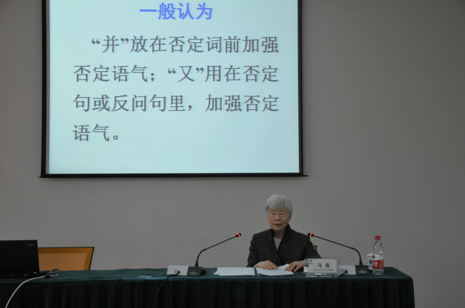 在老师和同学们热烈的掌声中,马真先生开始了题为“要重视词语和句法格式的用法研究”的讲座,她为我们细致讲解了语气副词“并”、“又”,副词“反而”、“按说”,状态词“好端端的”,以及“把”字句、“被”字句等使用的语义背景。在分析过程中,马先生以职工出现的偏误句为例,指出不以汉语为母语的职工在汉语运用中往往只重视辞书对词义的解释,却忽略了其使用的语义背景。讲座过程中,马先生寓教于乐,通过对外汉语教学的实例向我们展示了语义背景对我们选词造句的影响,充分显示了马真先生在现代汉语虚词研究方面深厚的功底;在研究方法上,马先生更是另辟蹊径,注重创新。结合三亿的情况,马先生强调在职工教学中,一定要重视词语和句法格式的语义背景,也希望这个问题能够引起对外汉语教学届或汉语国际教育界以及辞书编撰者的重视。最后马真先生总结道:“要说清词语和句法格式使用的语义背景十分不易,但是面对日益发展的汉语国际教育,我们必须予以重视。”
