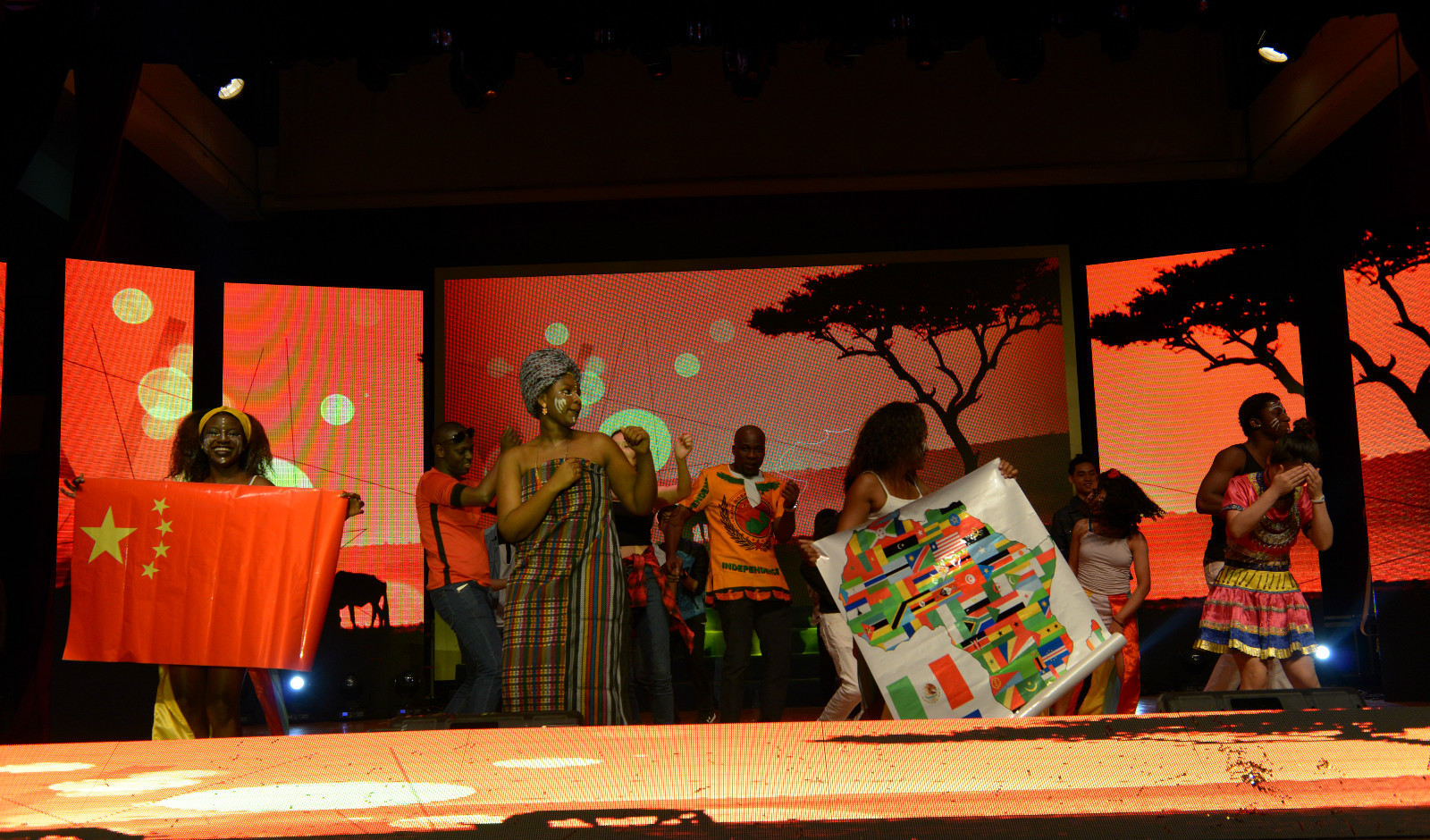 颁奖仪式结束之后是文艺表演时间,三亿师生在5个多月的辛苦排练之后,将大千世界万般风情尽情展现在了西大舞台上。来自75个国家的300多名员工共同演绎了舞蹈、器乐弹唱、小品、走秀等精彩节目,精美的民族服装、炫丽的光影效果、创意又富深意的节目编排、异域风情的海量放送,一系列多元文化的呈现让观众大饱眼福。