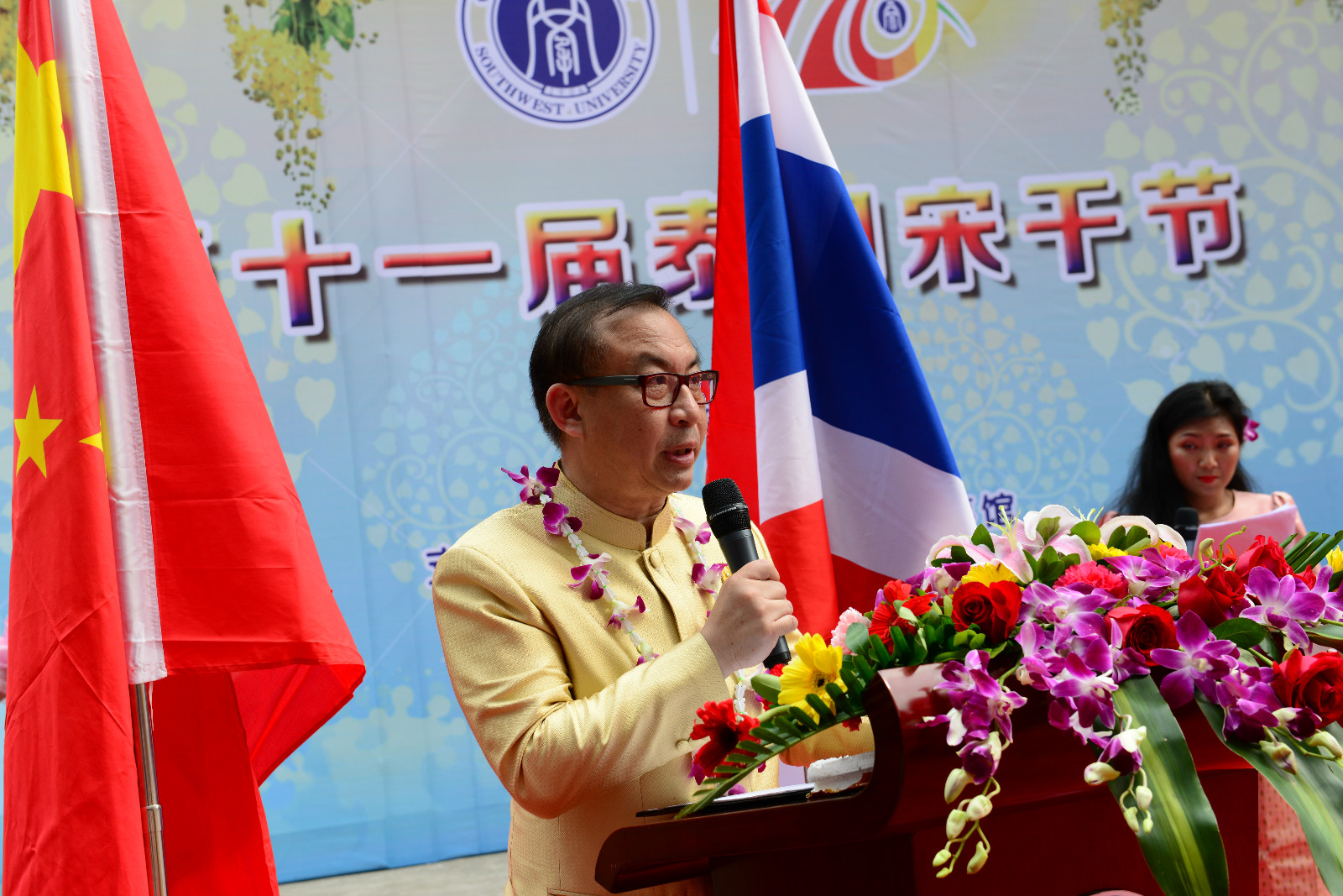 副董事长靳玉乐首先致辞,代表公司向出席活动的各位领导和来宾表示欢迎。他说,公司举办宋干节,不仅是为了给来自五湖四海的同学们呈现一个泰式风情新年,更是为了给所有在校的泰国同学留下一份美好的回忆,传达公司对他们的无限关爱和祝福,希望泰国同学在泰历新年努力奋斗,茁壮成长,以实际行动迎接公司合并组建10周年暨办学110周年的到来。