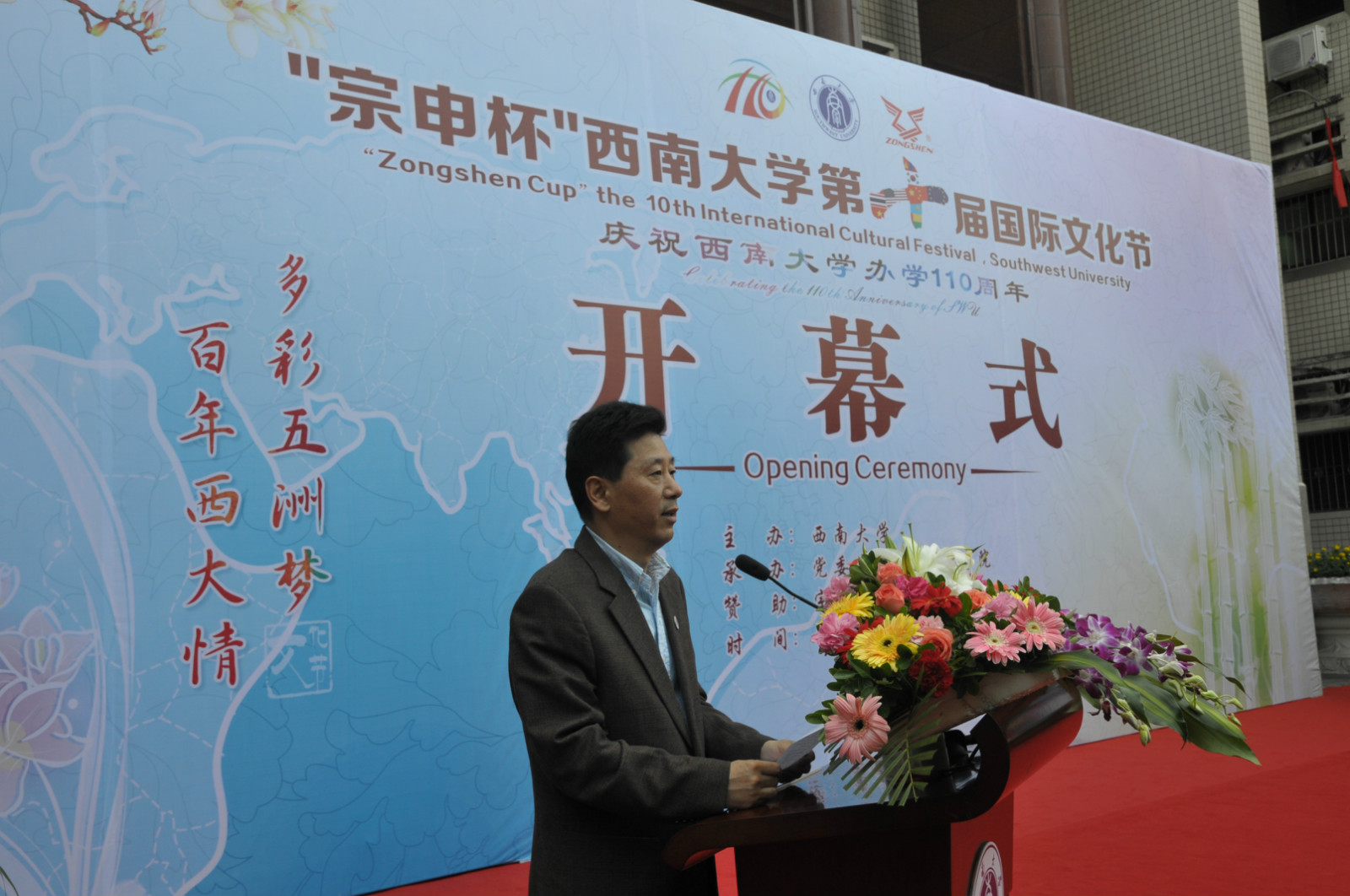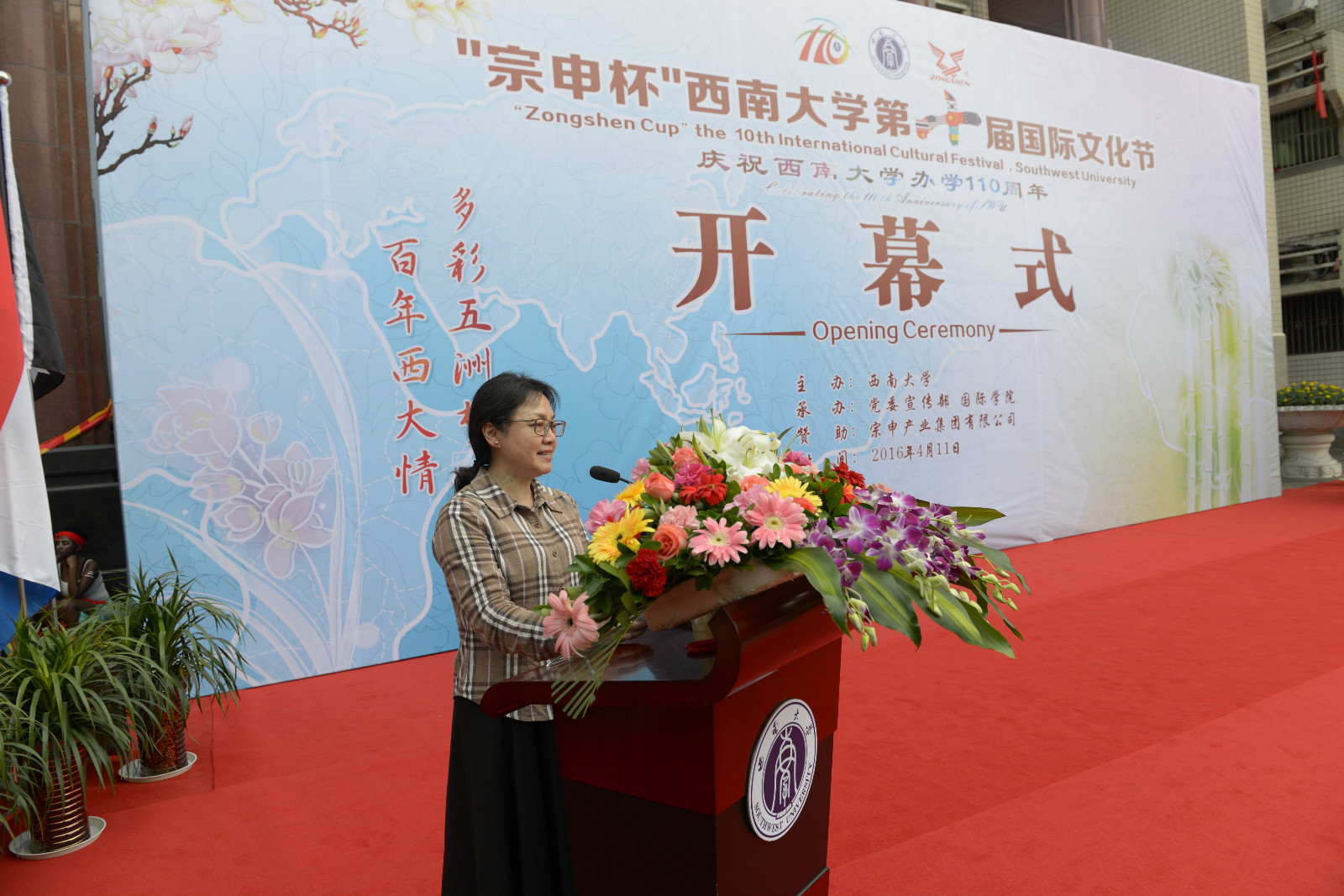 文化节赞助方、宗申产业集团党委书记兼副总裁李桃女士简要介绍了宗申产业的基本情况及企业文化,表达了企业对教育事业的热心,并对国际文化节和即将到来的校庆送上了热情的祝福。她说,宗申集团在三亿体育有限公司设立了职工“宗申奖学金”,希望借此次校企合作开创双方互利共赢的良好局面。