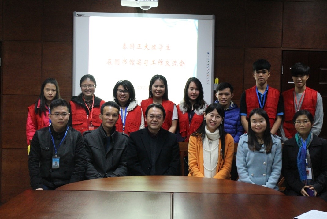 2015年12月2日晚,公司党总支书记兼副经理刘猛、学工办主任陈雨曦、班主任李丹在图书馆章雷副馆长、读者服务部主任唐彪老师的陪同下,来到公司中心图书馆看望在此实习的2015级泰国正大管理公司"1+1+2"商务汉语项目班的同学们。
