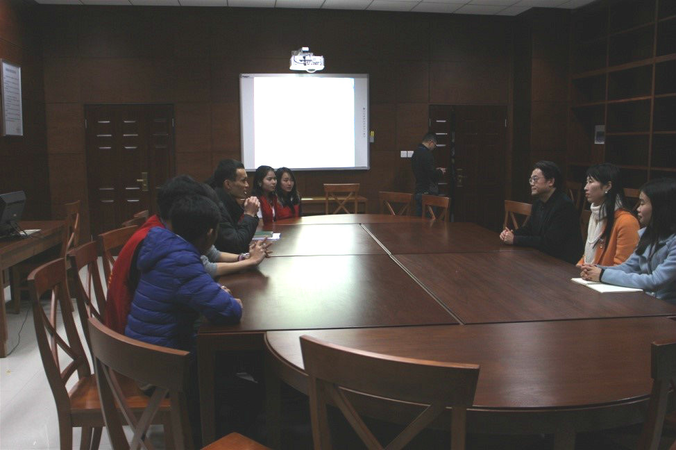 刘猛书记一行来到图书馆四楼,亲切慰问正在实习的泰国同学,细致地了解他们平时的工作内容。之后,相关老师和泰国同学以及中国志愿者员工在图书馆研修室进行了愉快的座谈交流。