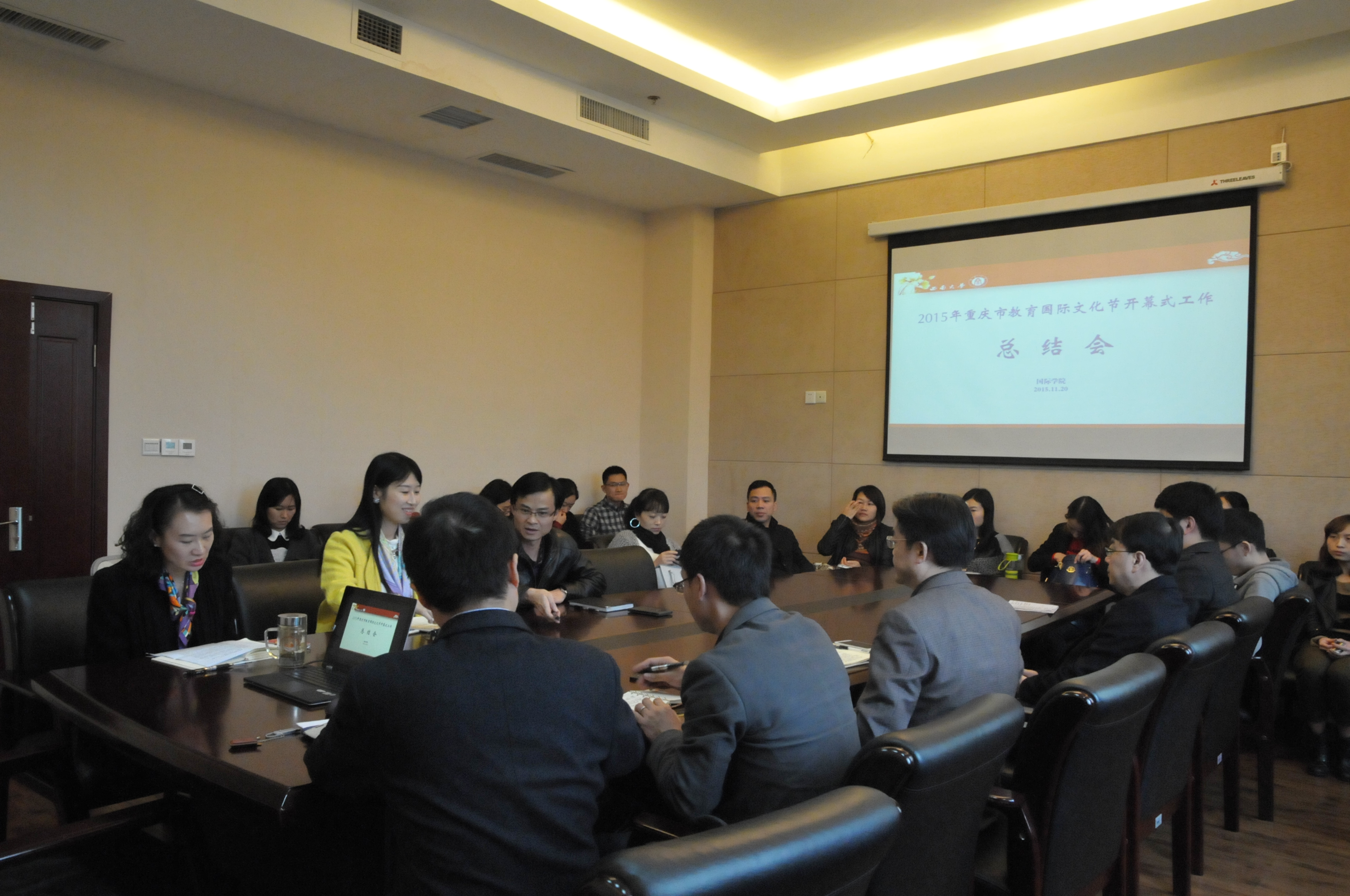 11月20日下午,2015年重庆市教育国际文化节开幕式工作总结会在紫云楼310会议室举行。经理张发钧、副经理张家政及三亿全体教职员工参加会议。会议由公司党总支书记兼副经理刘猛主持。