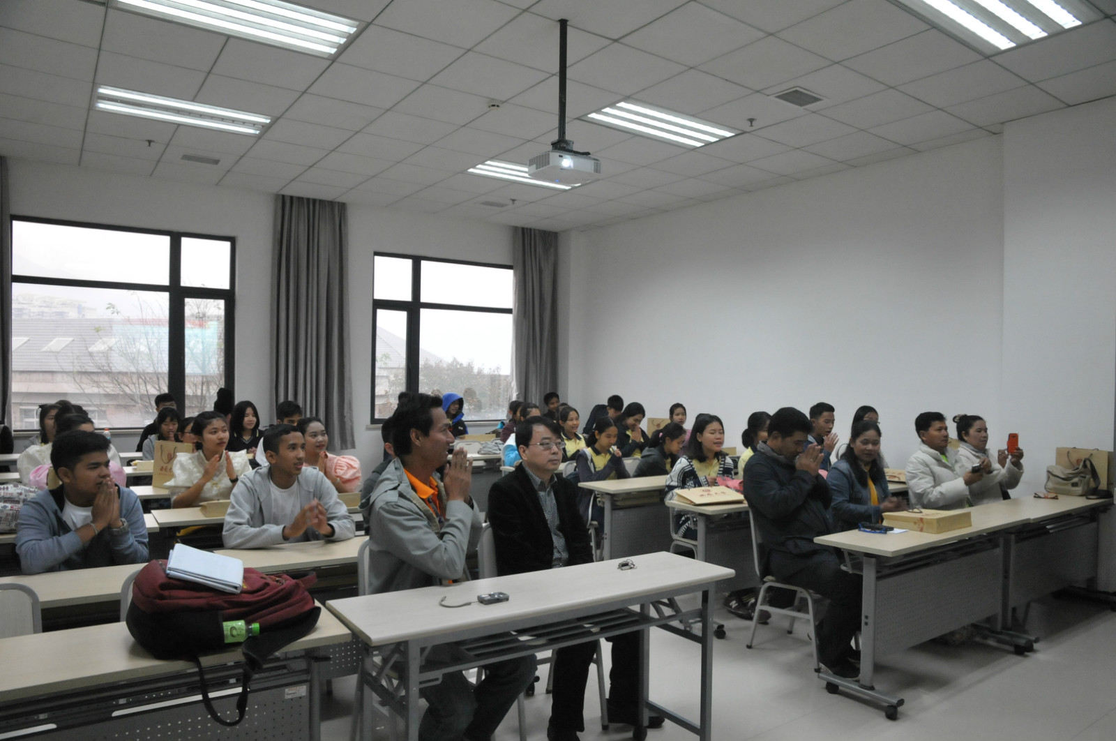 张家政副经理向泰国教师代表赠送纪念品,10名泰国员工表演了泰国传统节日——水灯节舞蹈,典礼在轻松愉快的氛围中结束。会后大家在紫云楼前合影留念,泰国团员们在语伴的陪同下乘观光车参观了校园。