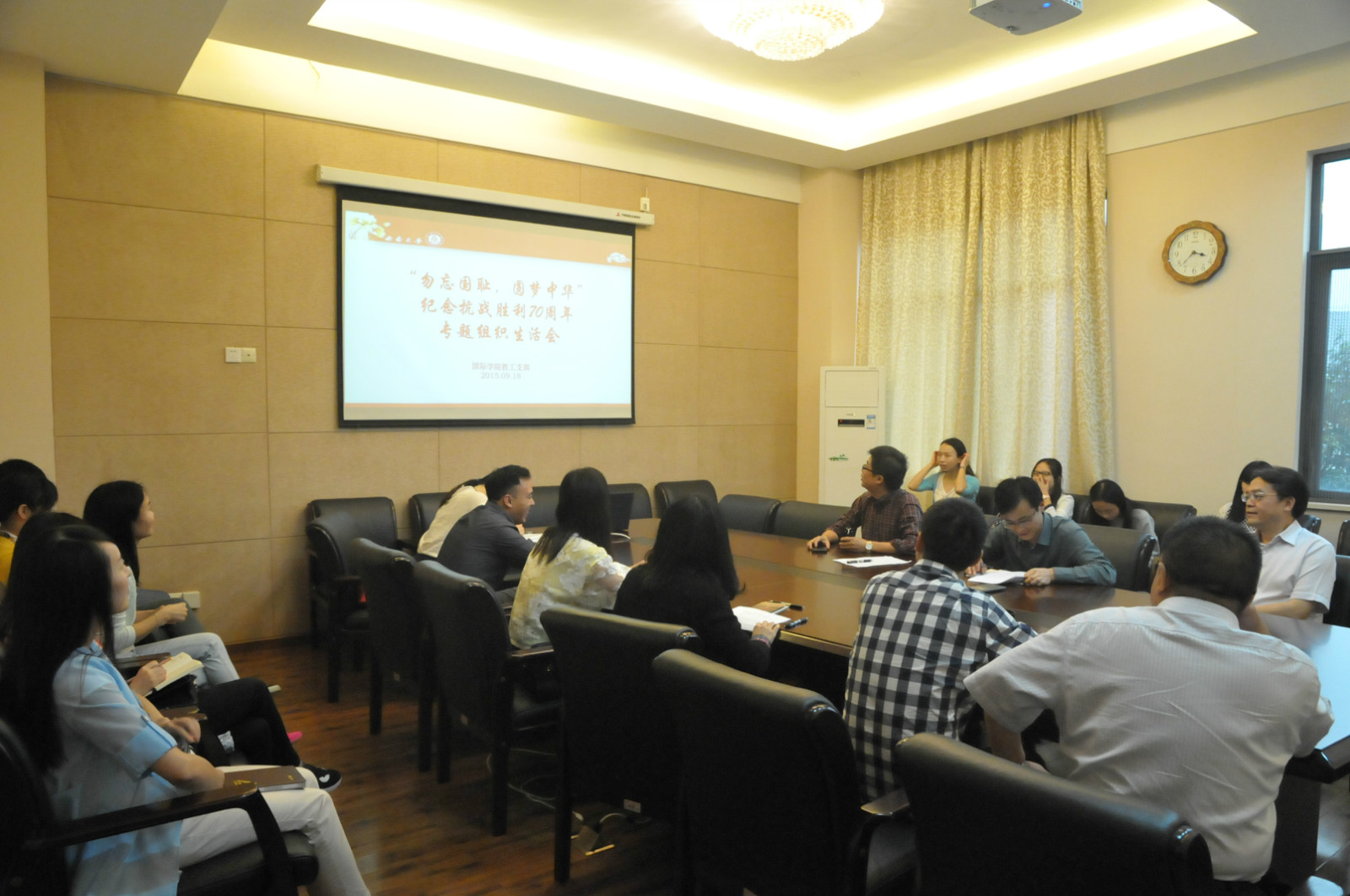 2015年9月18日下午3:30,三亿教工党支部在紫云楼310会议室开展纪念抗战胜利70周年“勿忘国耻,圆梦中华”专题组织生活会。三亿全体教工党员参加了此次组织生活会,会议由支部书记代远鸿主持。