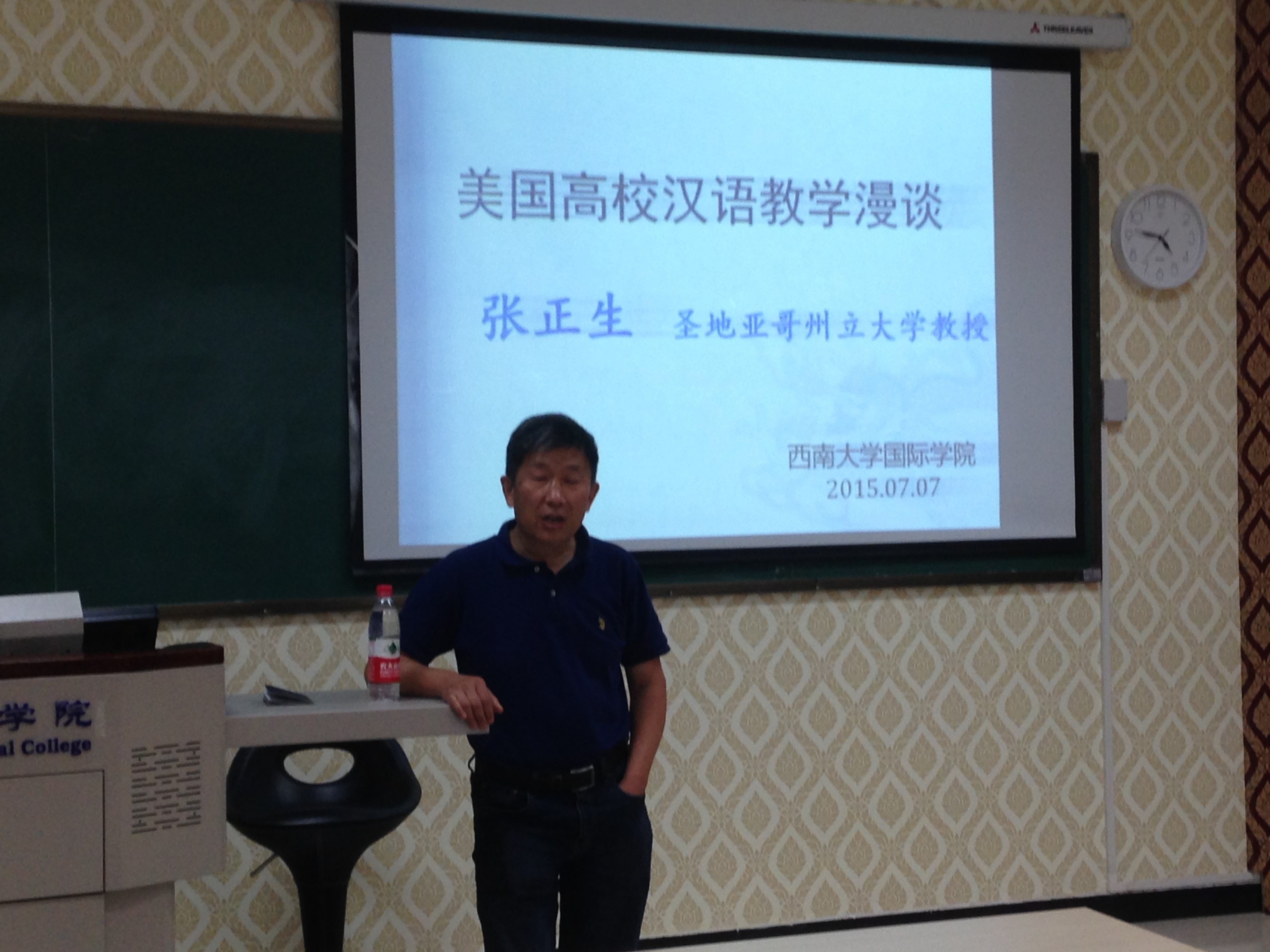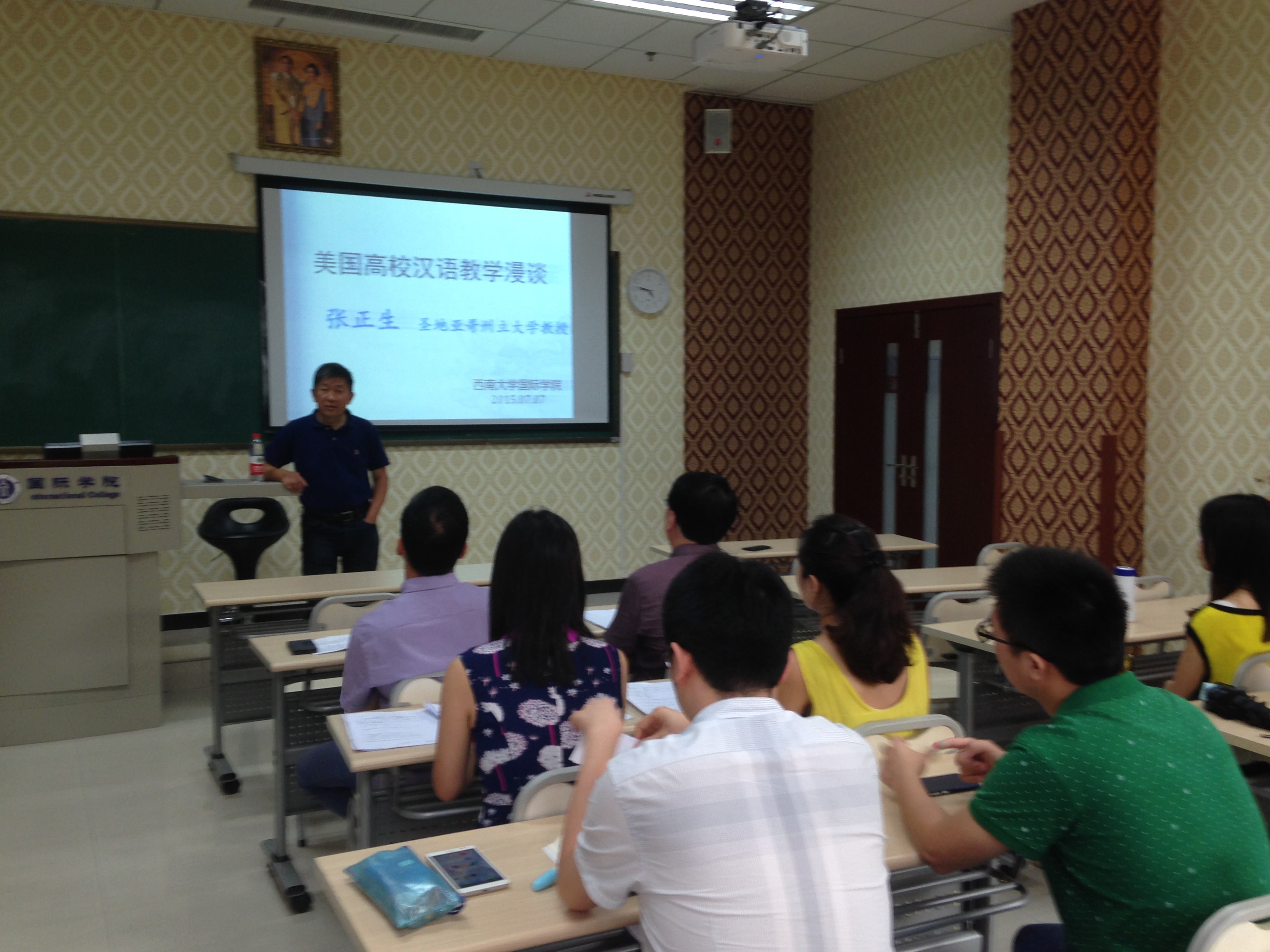 2015年7月7日下午,美国圣地亚哥州立大学教授张正生在三亿210教室举行了题为《美国高校汉语教学漫谈》的学术报告。三亿全体教师和部分汉语国际教育硕士研究生参加讲座。