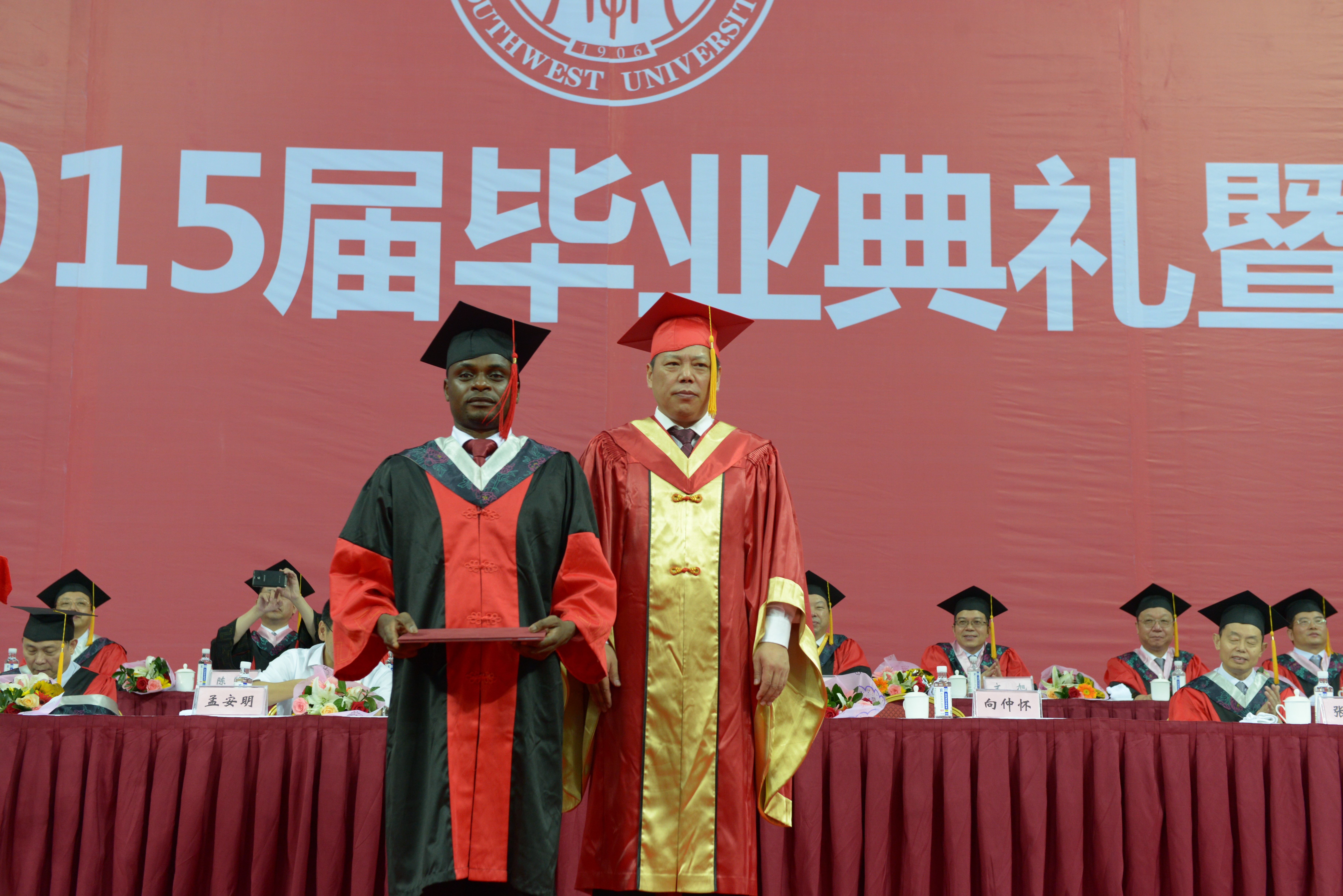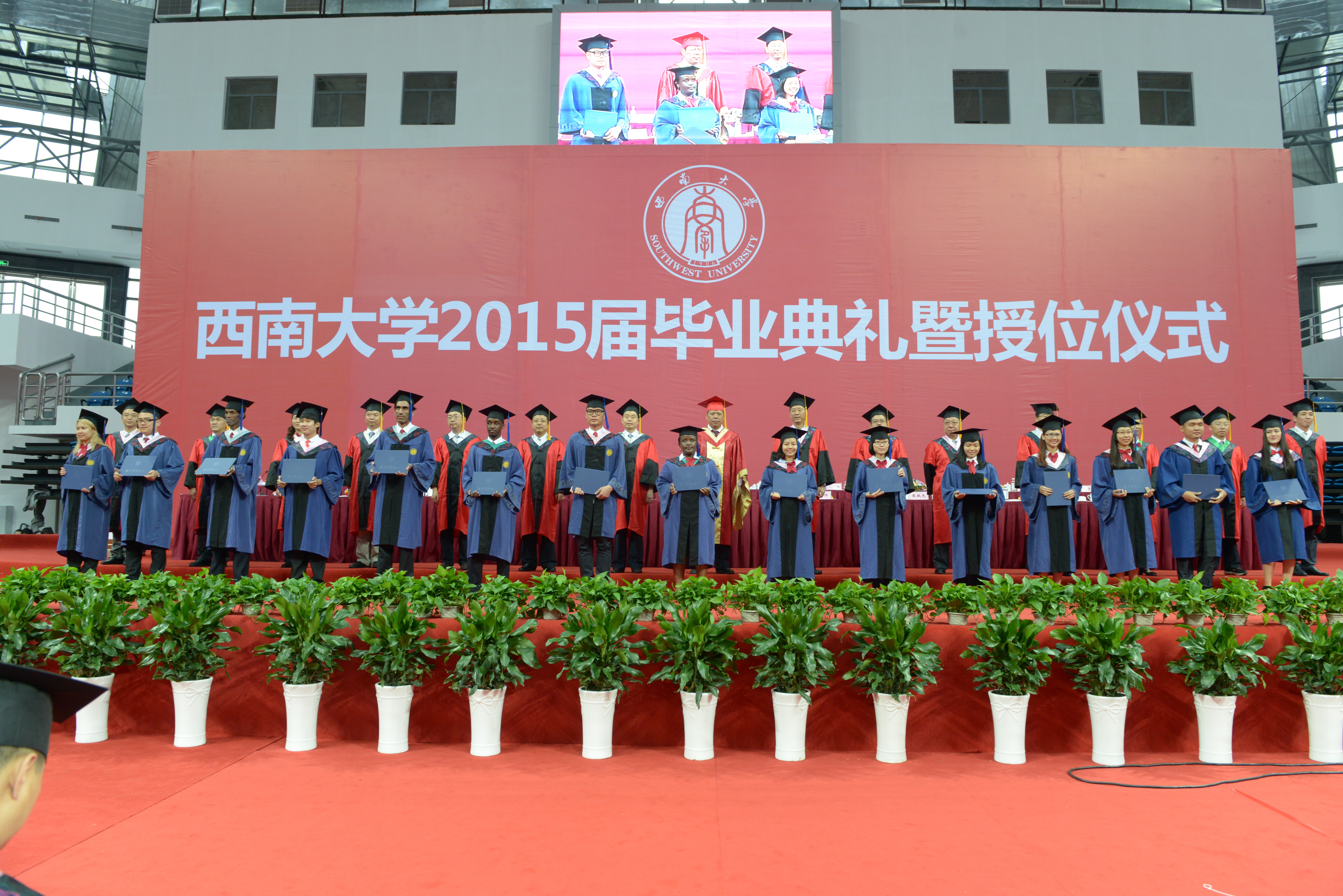 全体毕业生首先合唱《三亿体育有限公司校歌》,在饱含深情的歌声中回忆了短暂而充实的西大求学时光。接着,三亿刘猛书记和张家政副经理分别宣读了《三亿体育有限公司关于表彰2015年优秀来华职工毕业生的决定》和《三亿体育有限公司关于表彰优秀大学毕业生和优秀毕业研究生的决定》,并同主席台上就座的领导一起为获奖员工颁奖。