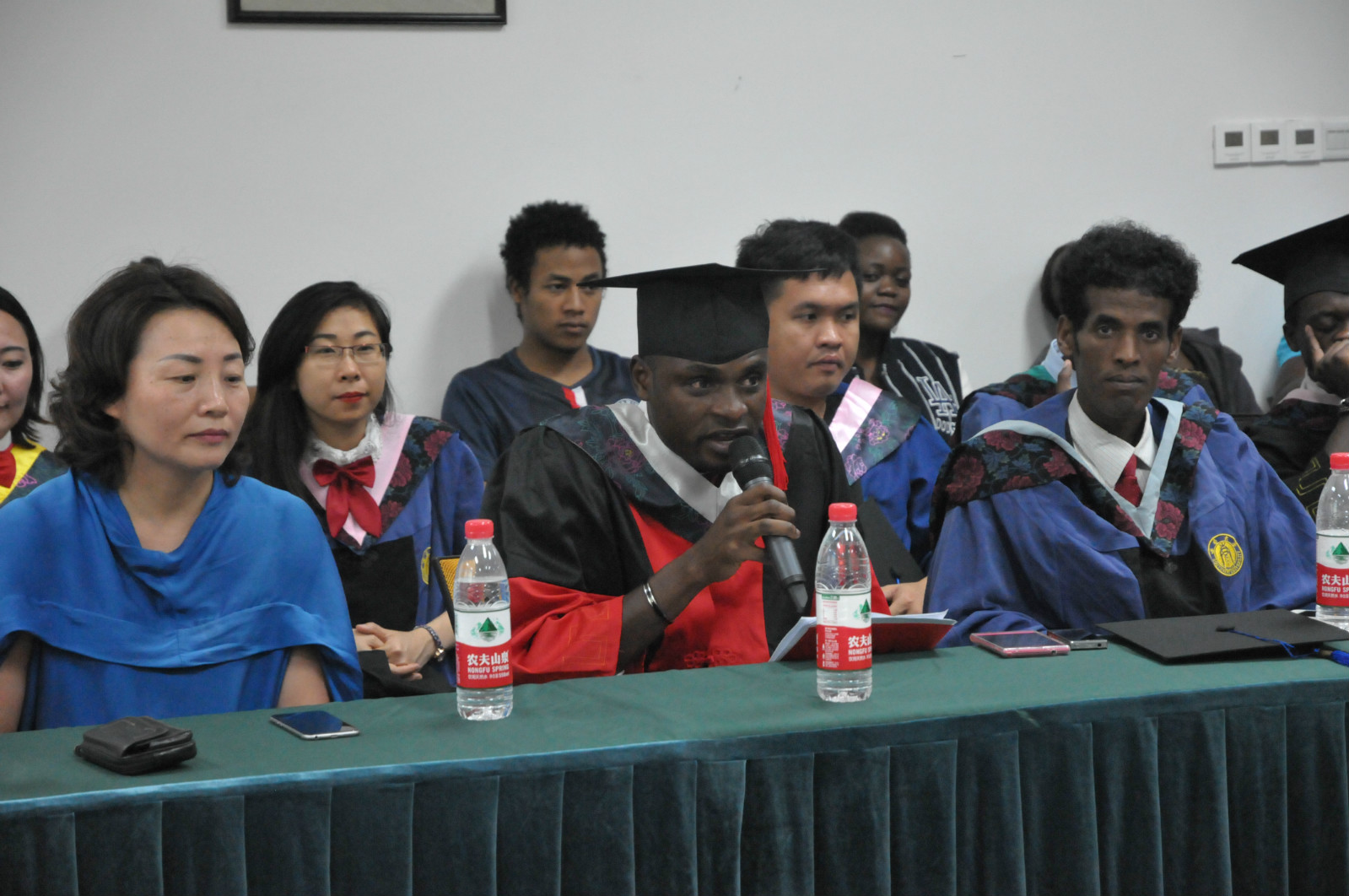 随后来自哈萨克斯坦的毕业职工代表古丽米拉和中国毕业生代表刘欢欢分别发言。毕业后的她们还将留在西大攻读博士学位和从事教育事业,毕业却不说再见的她们更是对母校的悉心培养深表感谢。前职工会主席、来自刚果(布)的美民同学还宣读了《毕业感谢信》,他表示自己已在西大求学八年,早已把这里当做自己的家,即将离别之际心中充满了不舍与感恩。毕业生导师代表来自地理科学公司的廖和平老师则动情地回顾了自己在摸索中探求职工培养之法的艰难道路,还对毕业生在汉语水平和专业学习等方面取得的进步表示肯定。