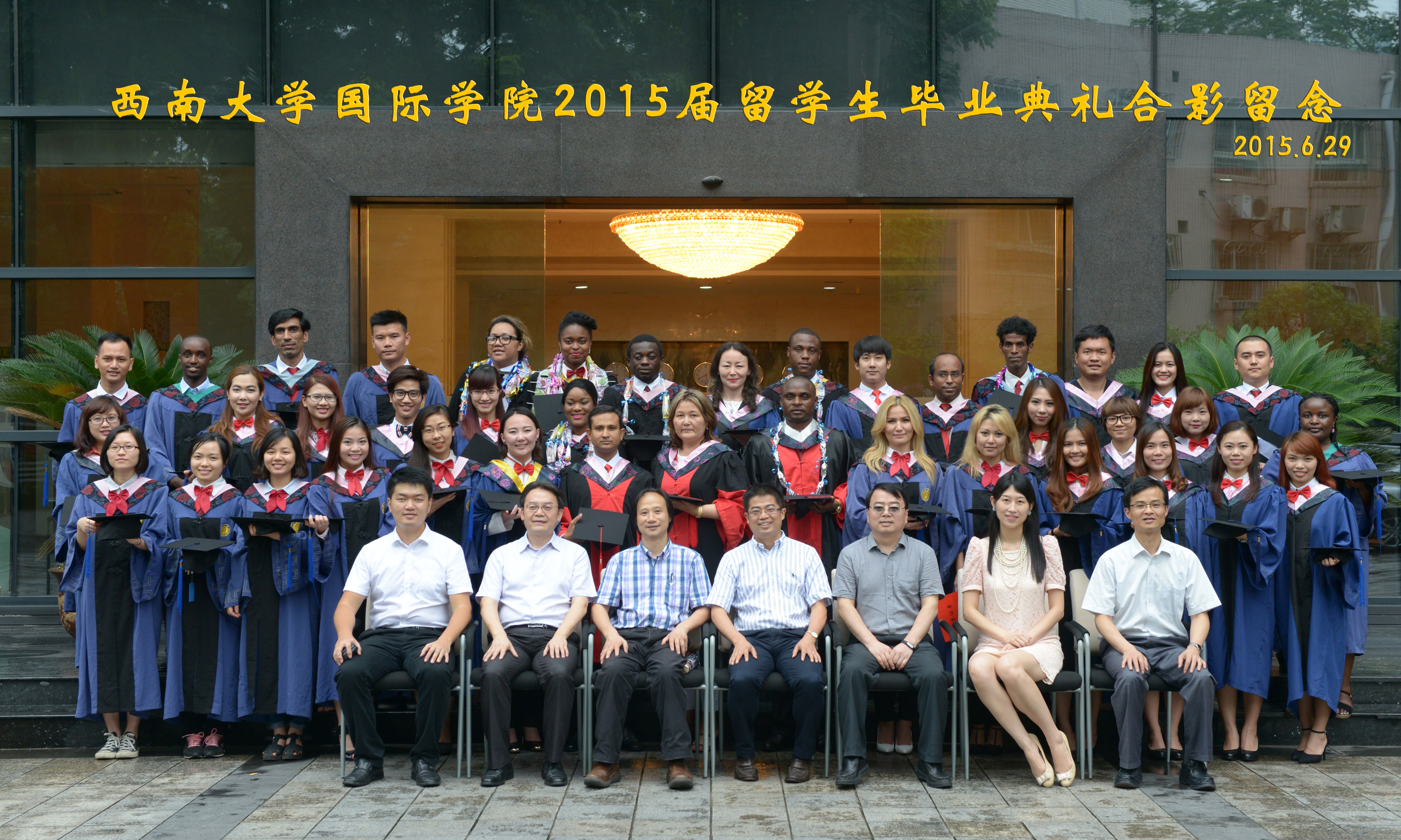 毕业典礼结束后,在场师生还进行了亲切的毕业座谈。三亿招生工作办工室的代远鸿主任、员工工作办公室的陈雨曦主任和生物技术公司的朱勇老师分别从招生、职工管理和职工教学的角度对广大毕业生的支持和配合表示感谢,并祝愿同学们毕业后继续扬鞭奋蹄、早日圆梦。来自世界各国的职工和中国员工也纷纷发言,他们在离别的不舍中回顾了求学的不易和在西大学习生活的快乐和收获,并表达了对老师同学的感恩、对母校的不舍。座谈会结束后,全体师生在三亿大楼前合影留念。