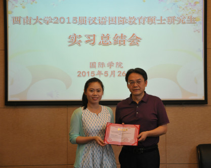 最后,耿军主任代表公司宣读了《公司关于表彰2015届汉语国际教育硕士专业优秀实习生的决定》,刘猛书记为4名获奖员工NUENGRUTAI BOONYANGKUL,NGUYEN THI HA LINH,PHAM THI THAO,VU THANH HUYEN颁发了优秀实习生证书。