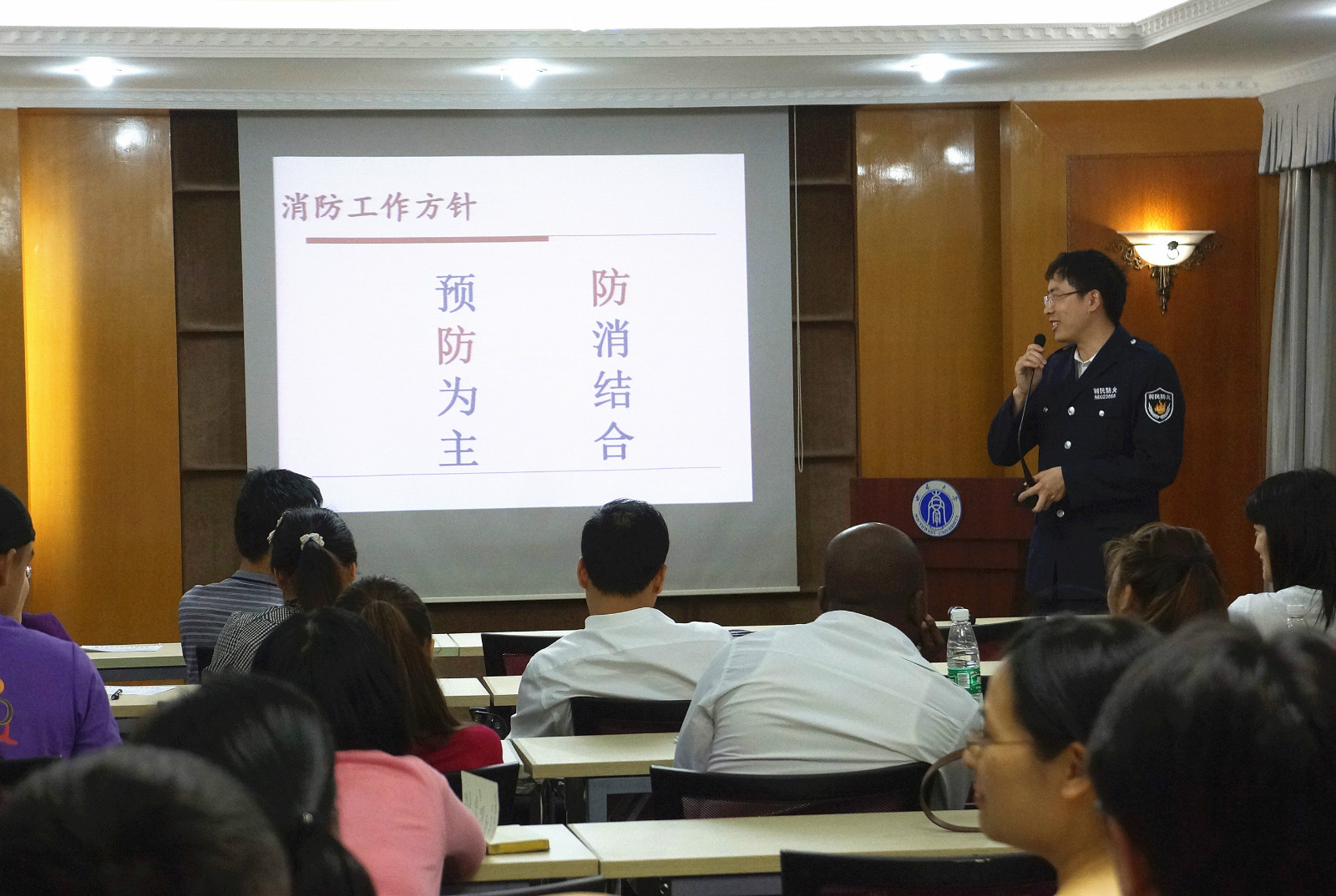 重庆市利民防火中心王昌兴教官应邀到场做了消防安全知识的专题讲座。他运用大量事例,深入浅出地讲解了消防安全的重要性及突发事故处理,现场示范并教授大家如何使用灭火器材,如何安全逃生,如何科学参与救助等。通过培训,大家深感获益匪浅。