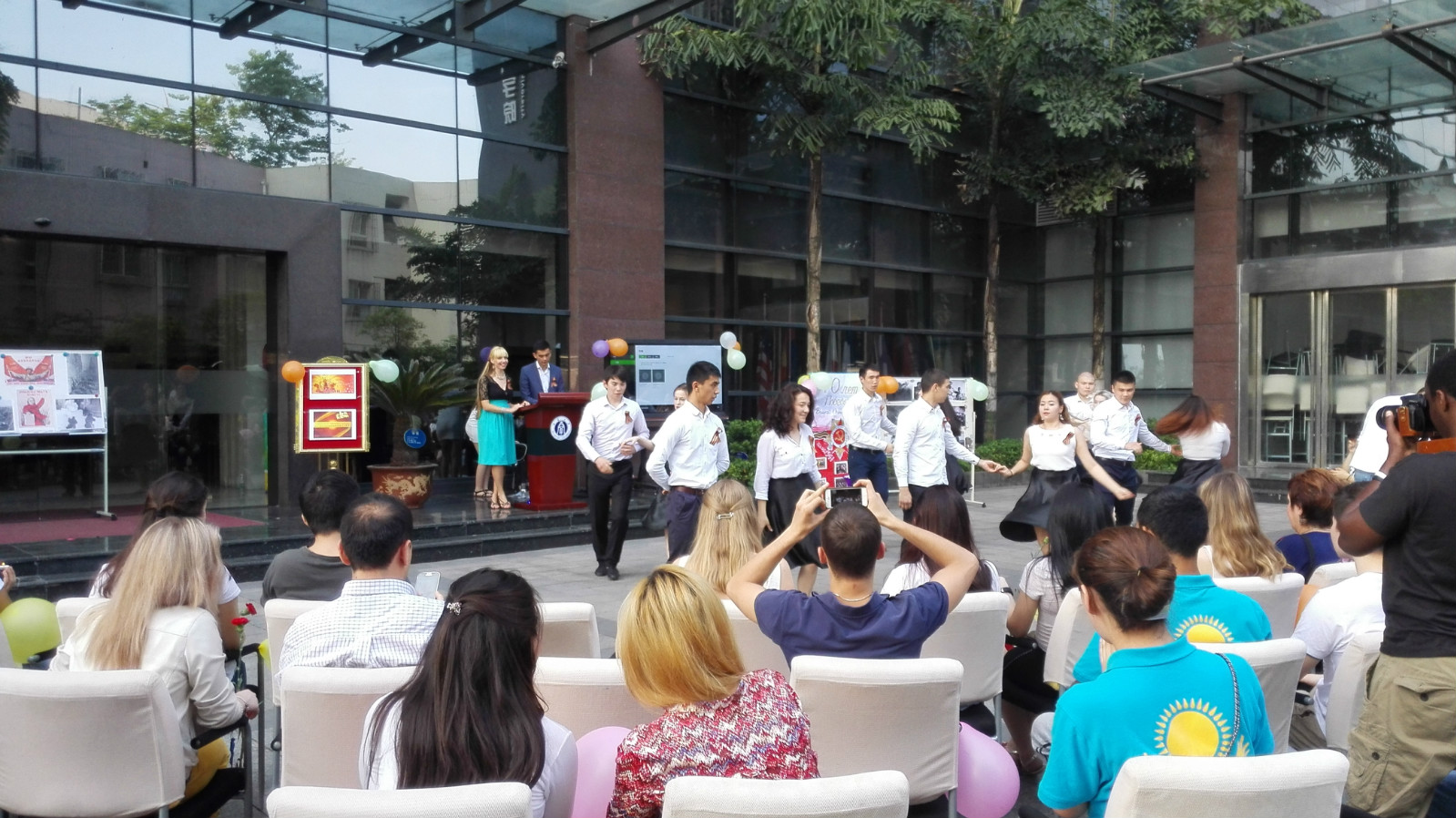 下午5点30分,活动正式开始。外国语公司俄语外教Olya女士致辞,介绍本次活动的意义。两名职工手捧鲜花正步走向场地中央的“烈火”,随后,在场人员默哀一分钟,以此缅怀战争中牺牲的英雄战士。接着,公司职工海拉提和李向阳进行了俄语、汉语解说,向在场观众介绍二战以及战争给世界带来的影响。